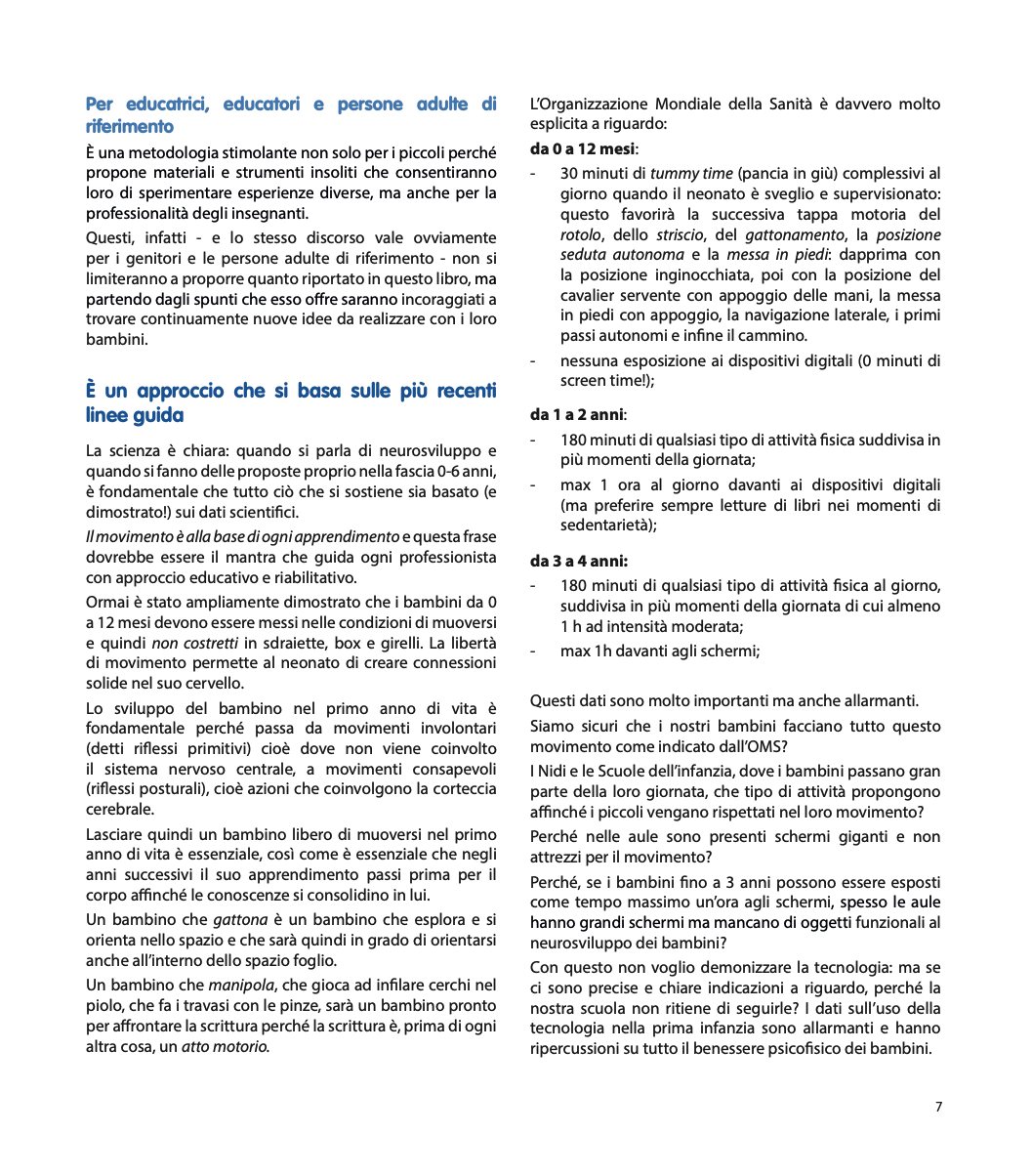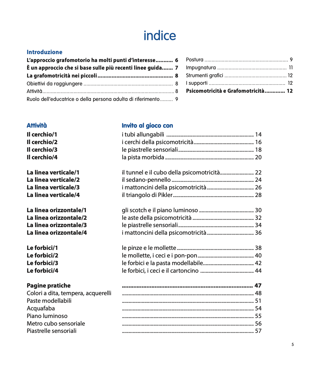 Nelle “Pagine pratiche” alla fine de libro vengono presentati utili suggerimenti per costruire da soli, dove è possibile, alcuni degli strumenti necessari per svolgere le varie attività. Un libro quindi estremamente pratico, utile per ricreare le attività in qualsiasi contesto (casa, Nido o all'aria aperta) ma anche ricco di nozioni teoriche basate sulle più recenti Linee Guida Internazionali.