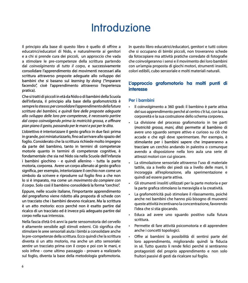 Il principio fondante dell'approccio grafomotorio è considerare il movimento alla base di ogni apprendimento: stimolare le pre-competenze della scrittura significa partire dal corpo, coinvolgendo prima la motricità grossa, e dopo le mani e le dita per favorire la motricità fine.
