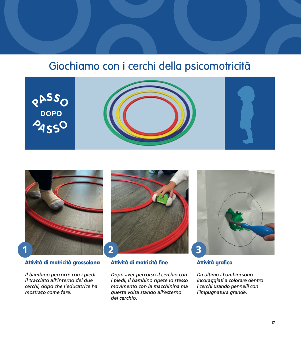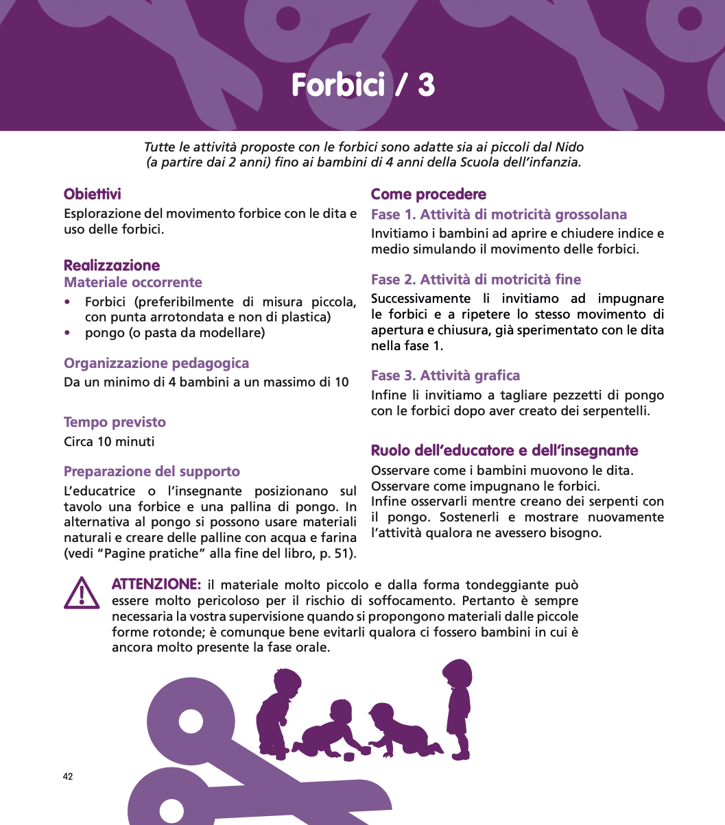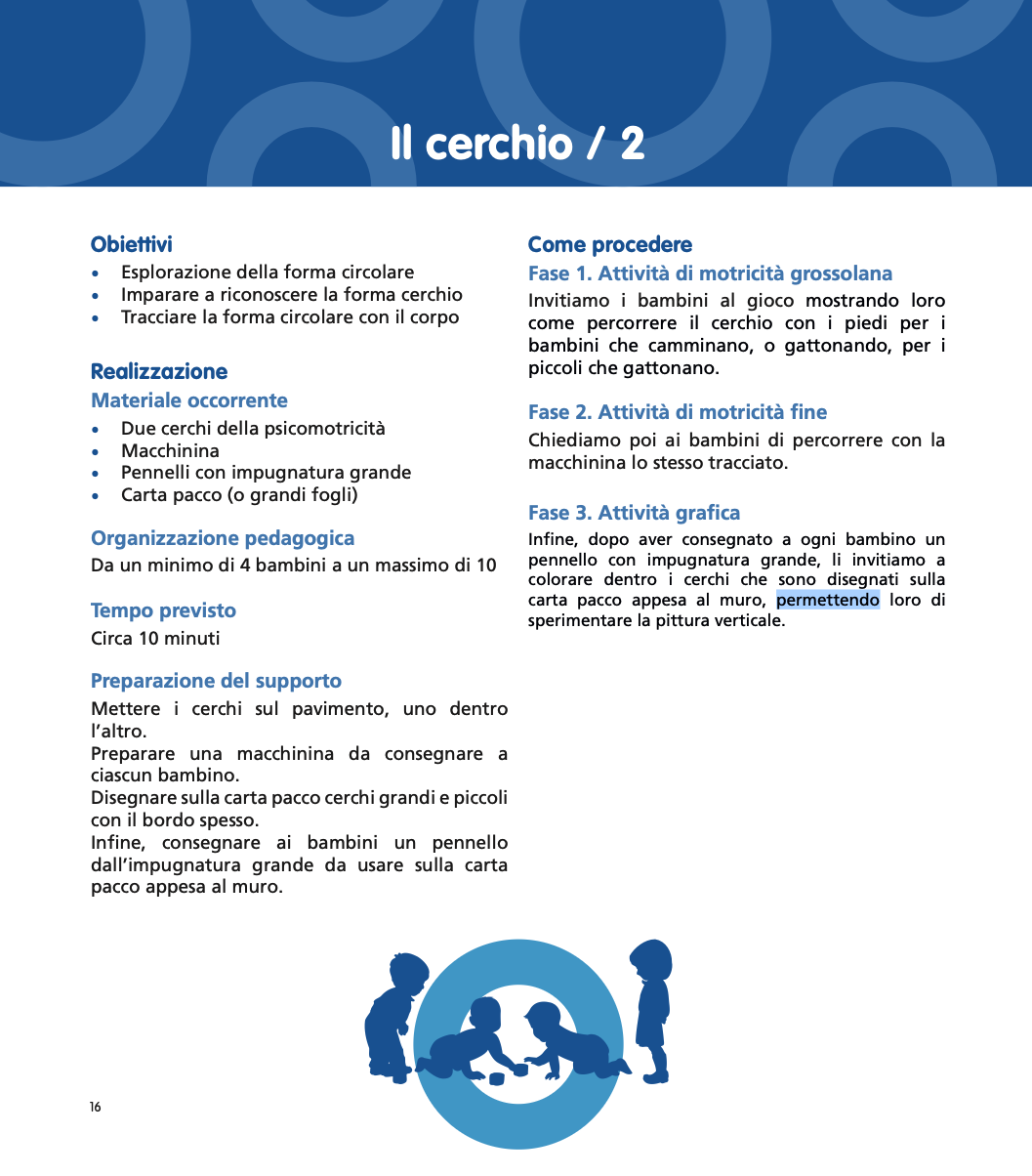 In questa fascia di età compresa tra 6/12 mesi e i 3 anni, più che di attività possiamo parlare di invito al gioco: i piccoli sono incoraggiati a esplorare, a manipolare, a sperimentare. Fondamentale diventa il ruolo della persona adulta di riferimento che prepara il materiale e osserva come i piccoli lo utilizzano: le proposte presenti in questo libro sono il cerchio, le linee orizzontali e verticali, lo strumento forbici e diversi materiali su cui lasciare traccia.