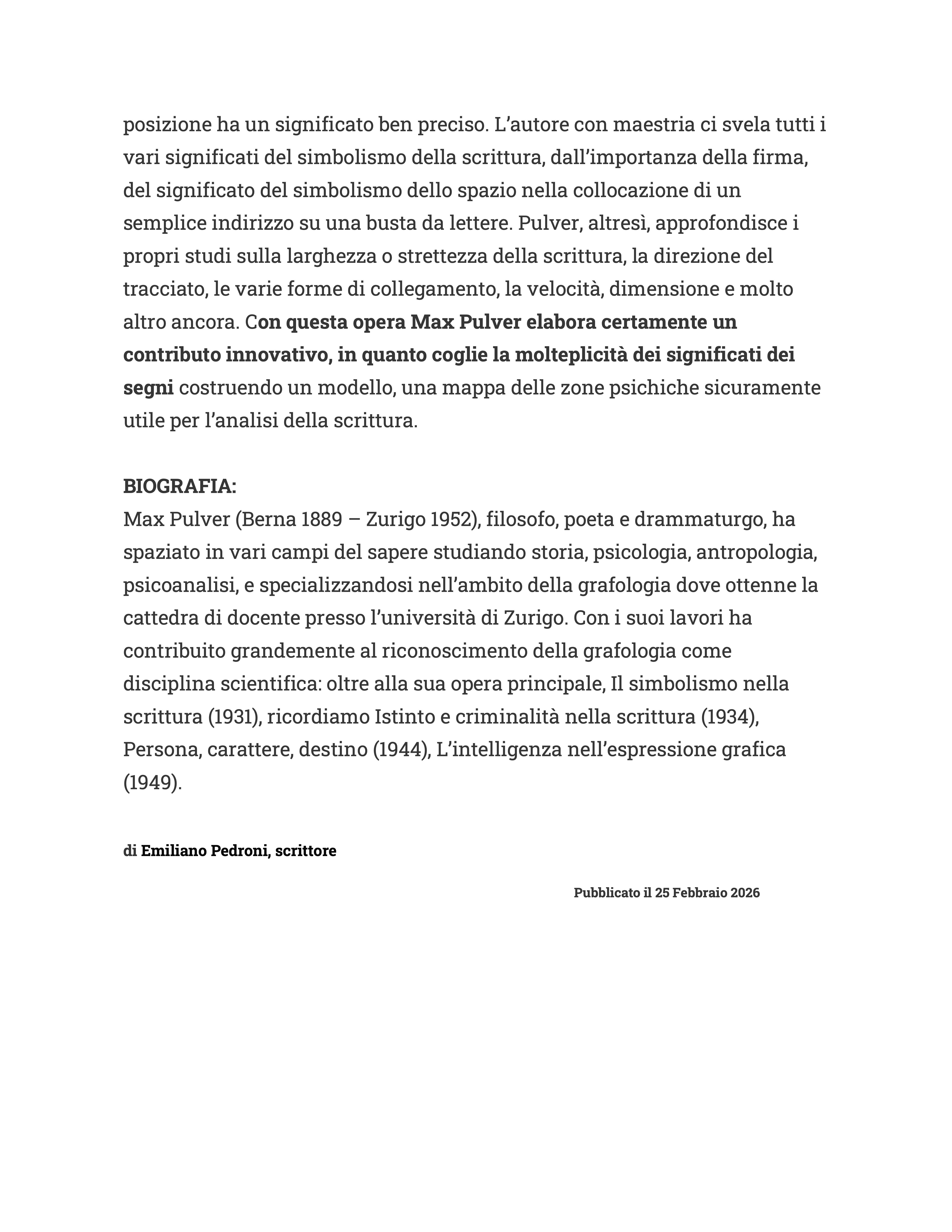 Max Pulver (1889-1952), filosofo, drammaturgo e poeta, ha spaziato in vari campi del sapere studiando storia, psicologia, antropologia, psicanalisi e specializzandosi nell’ambito della grafologia per la quale ottenne la cattedra di docente presso l’università di Zurigo. Con le sue opere ha contribuito grandemente al riconoscimento della grafologia come disciplina scientifica.
