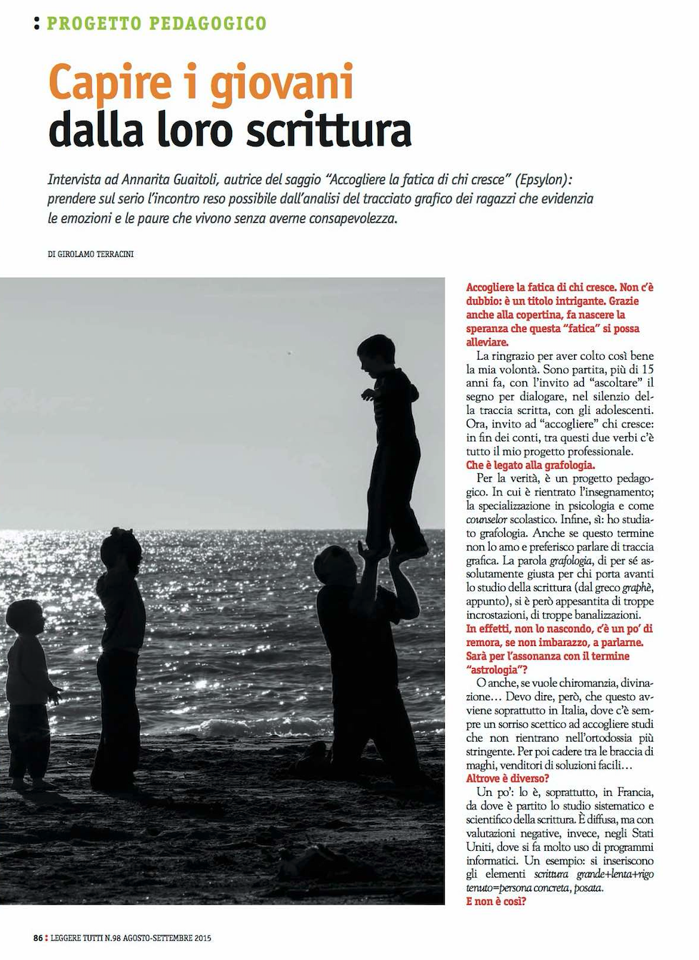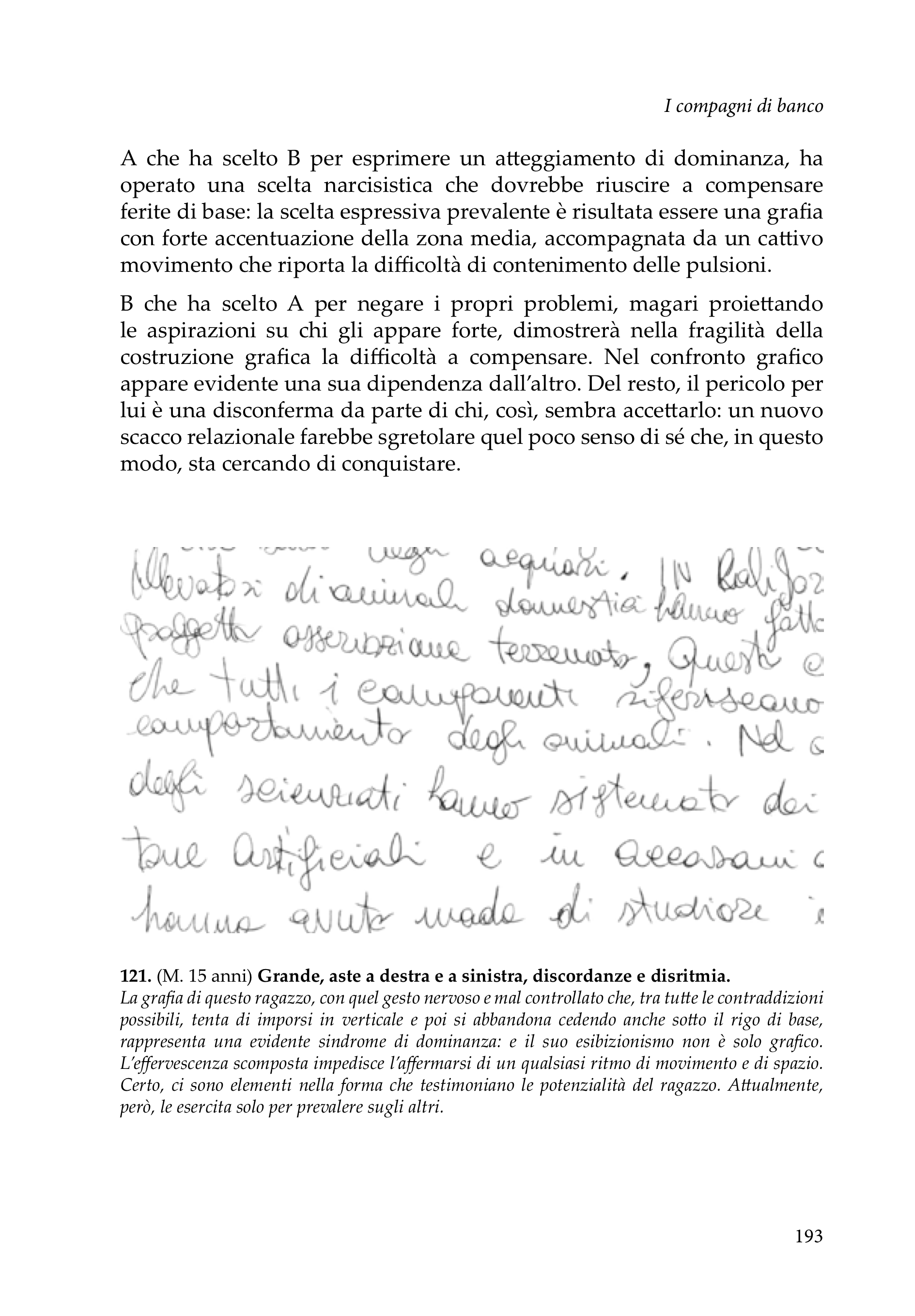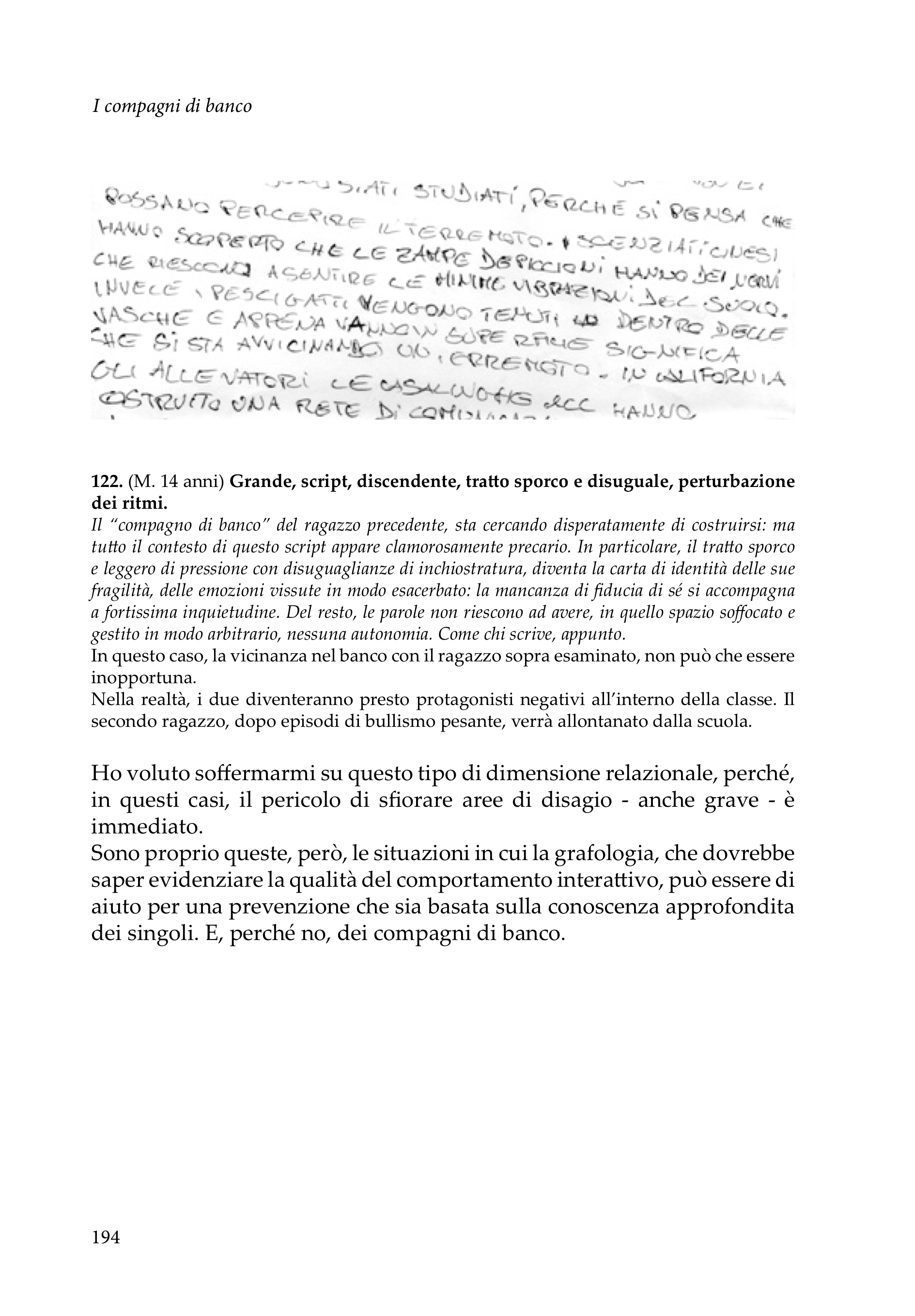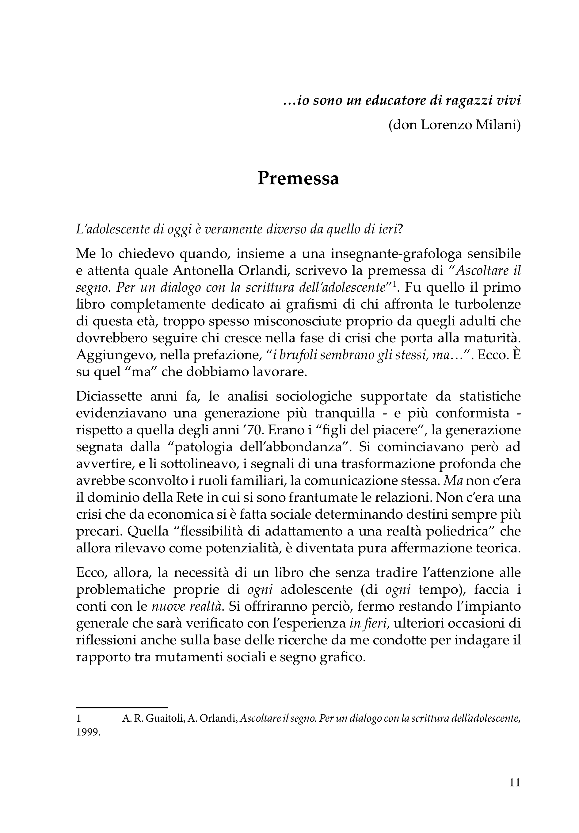 Unendo la sua lunga esperienza di insegnante alla sensibilità della grafologa, Anna Rita Guaitoli compie un’analisi approfondita che si basa sui contributi delle le scuole grafologiche, morettiana e francese, arricchiti da riflessioni e risultati di ricerche personali. Il libro è suddiviso in 6 capitoli dedicati ai grandi temi specifici dell’età adolescenziale: all’interno di ogni capitolo, vengono analizzate le specie che rivelano gli aspetti prevalenti del tema trattato, illustrate con molti esempi di scritture. Ogni capitolo termina con “spunti di riflessione” e “approfondimenti” che spaziano dalla brutta scrittura al borderline, ai disturbi d’ansia, la fobia scolastica, l’anoressia, il bullismo…