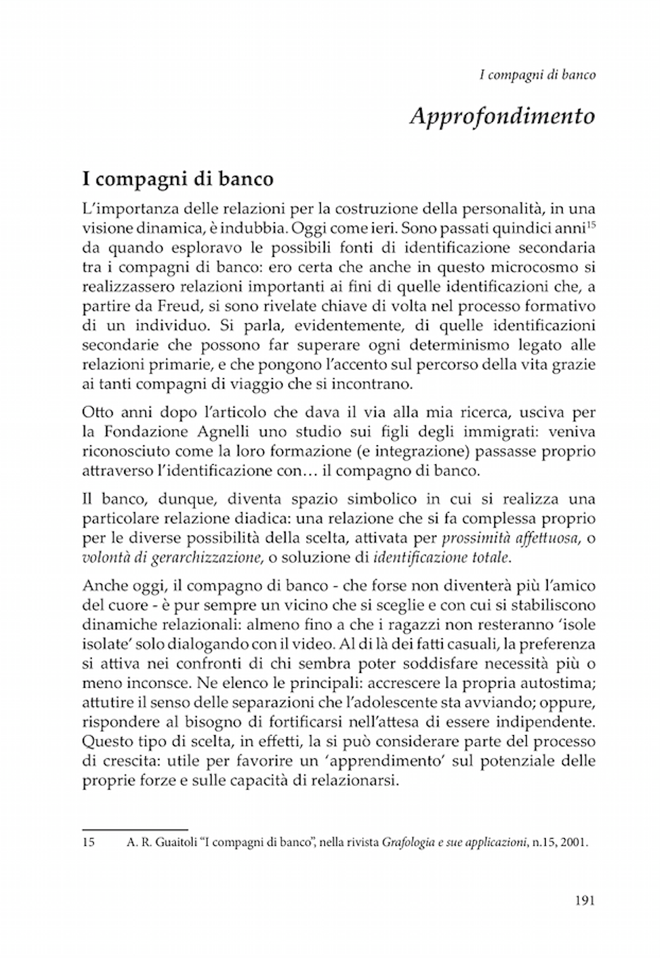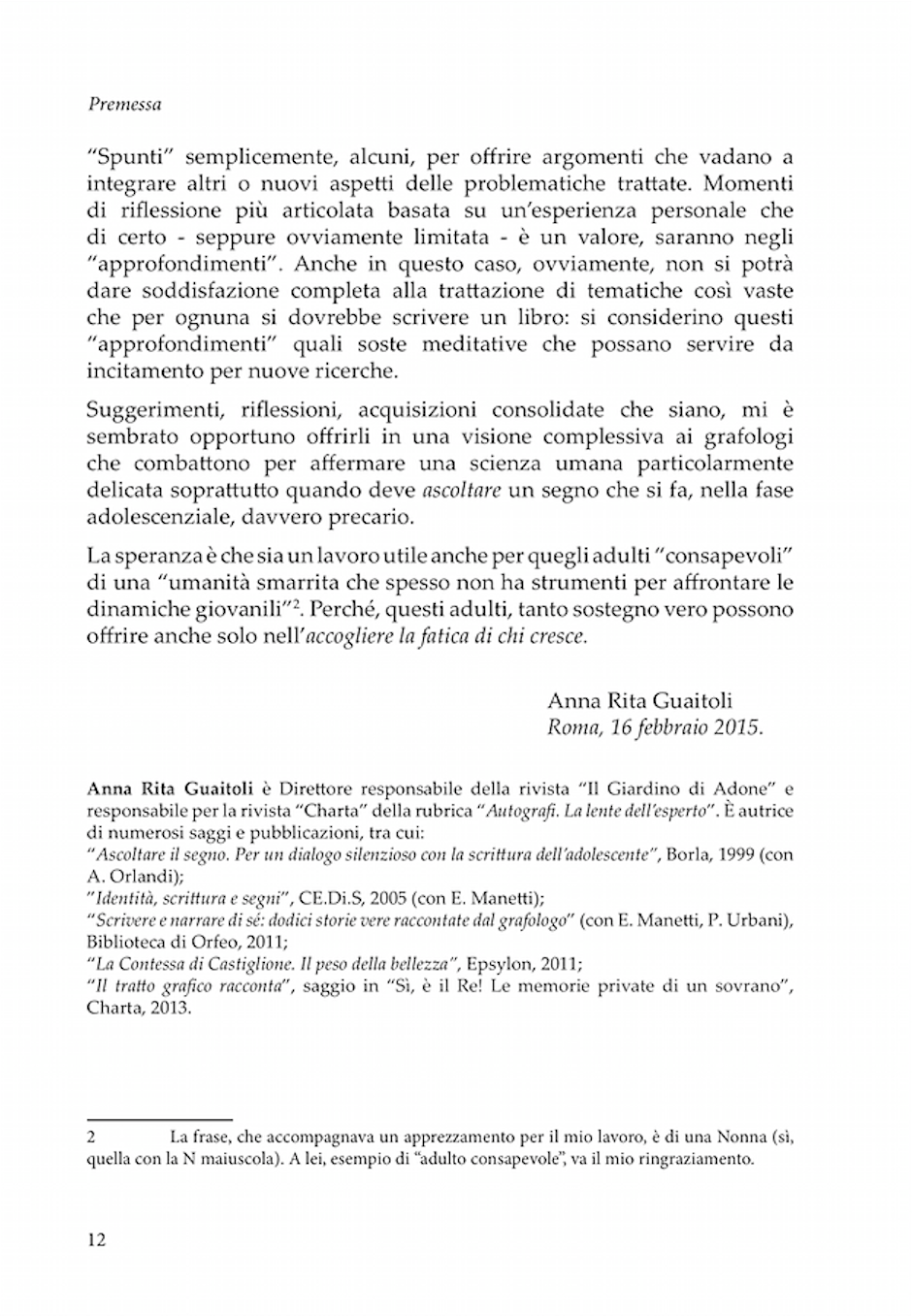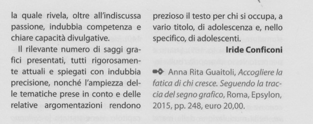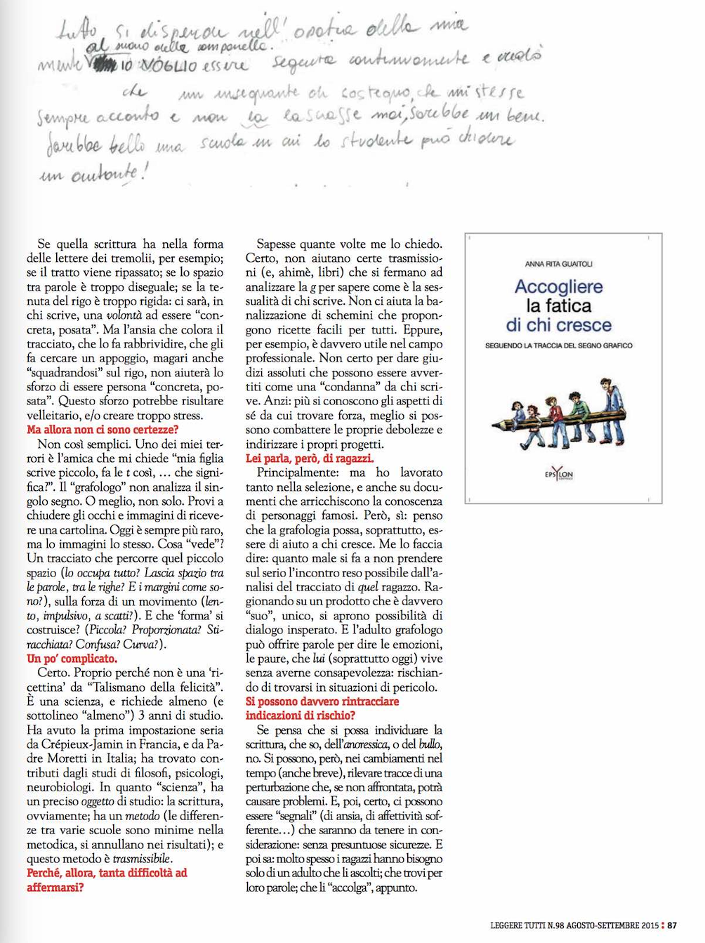 Questo secondo lavoro afferma, grazie anche all’approfondita preparazione psicologica, l’indiscussa competenza dell’autrice nel campo delle scritture degli adolescenti. Il libro si rivolge non solo ai grafologi e ai professionisti che operano nel campo dell’età evolutiva; ma è dedicato a tutti gli adulti perché “tanto sostegno vero possono offrire anche solo nell’accogliere la fatica di chi cresce”.