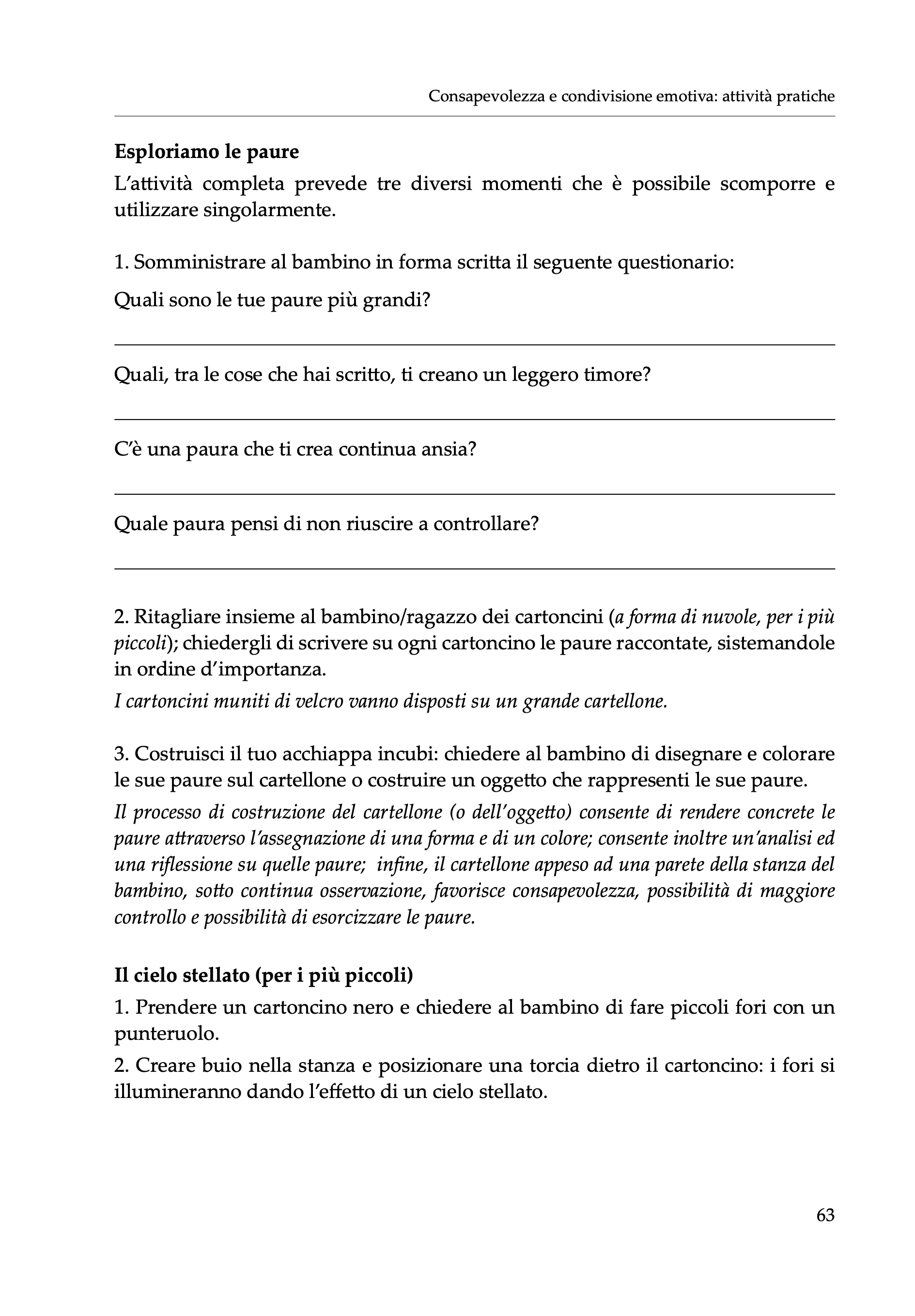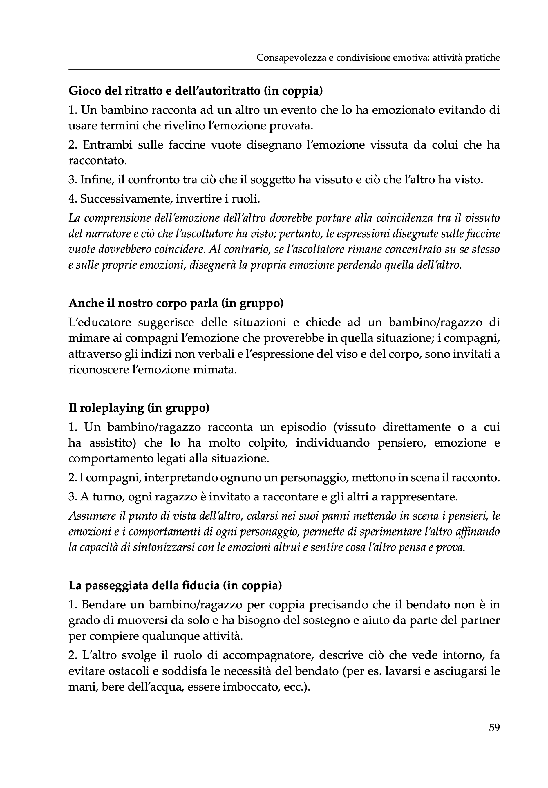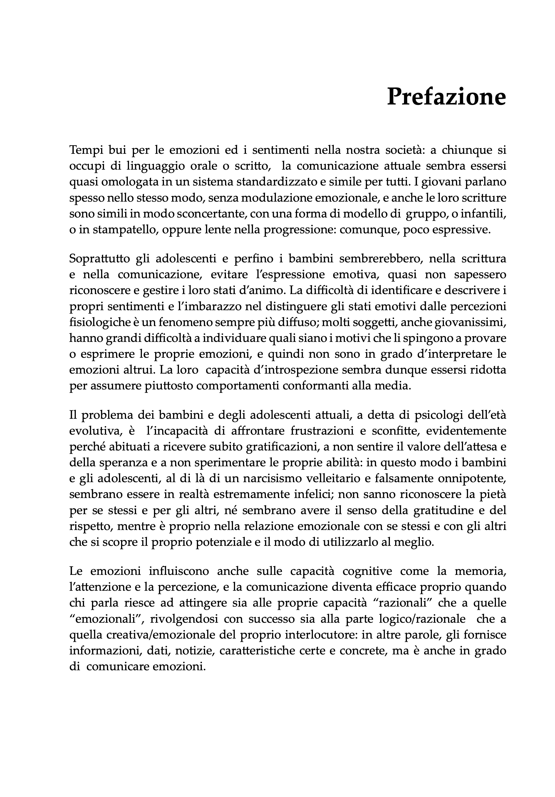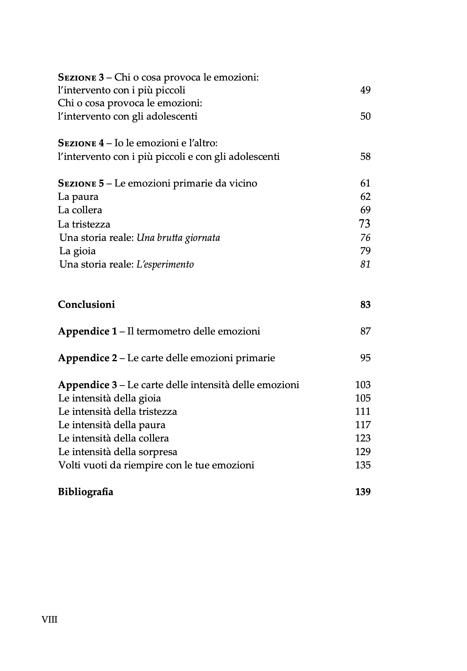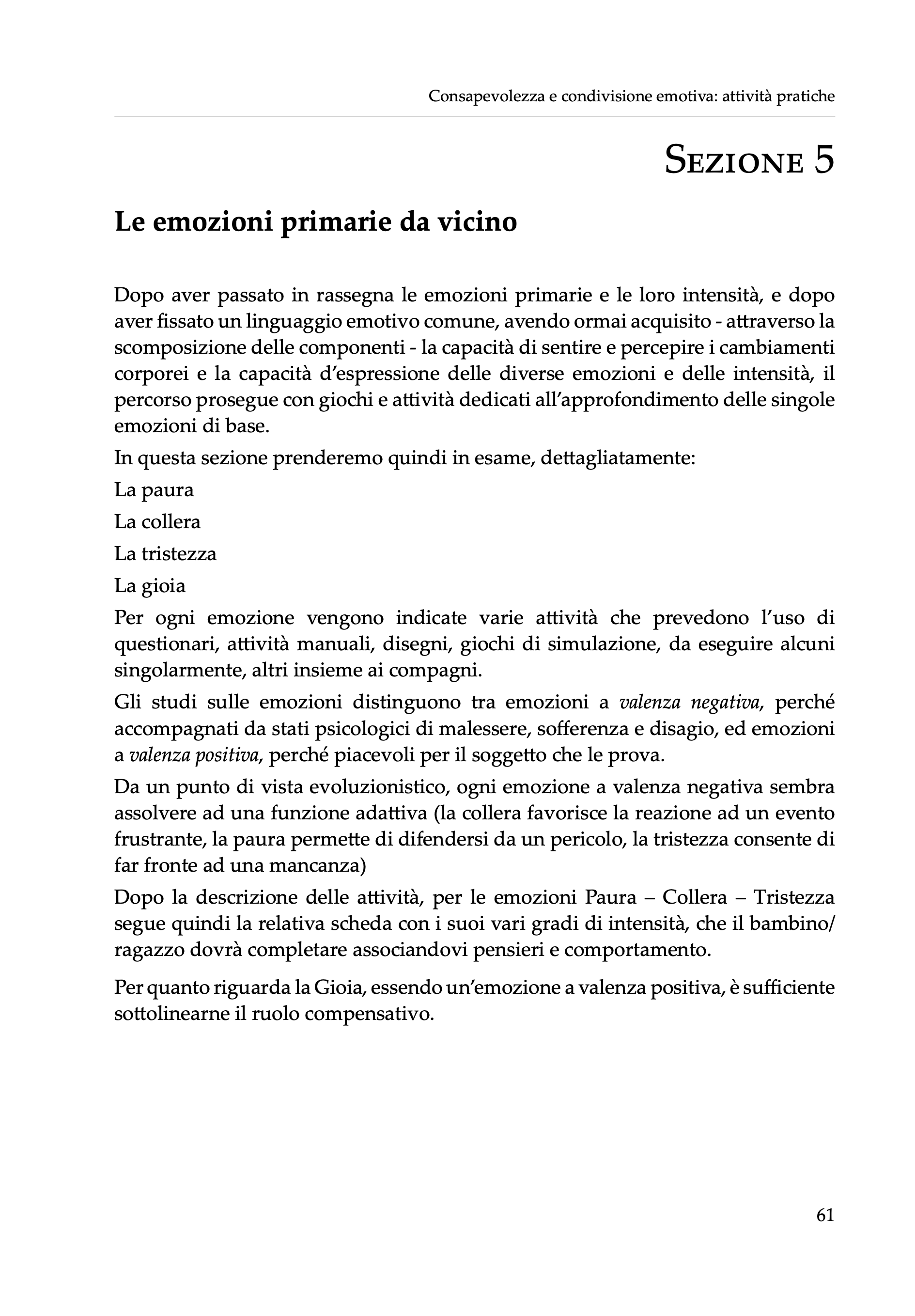 Il testo, scritto in modo pratico e vivace, prevede una prima parte teorica in cui vengono esposti i principali studi sulle emozioni, per passare poi a una parte pratica in cui - attraverso la spiegazione di attività varie centrate sulle emozioni (questionari, lavori manuali, storie e giochi di simulazione che l’adulto può concretamente utilizzare durante gli incontri) - i bambini o gli adolescenti vengono guidati verso la consapevolezza, l’accettazione e la regolazione delle proprie emozioni e quindi verso la comprensione delle emozioni degli altri.