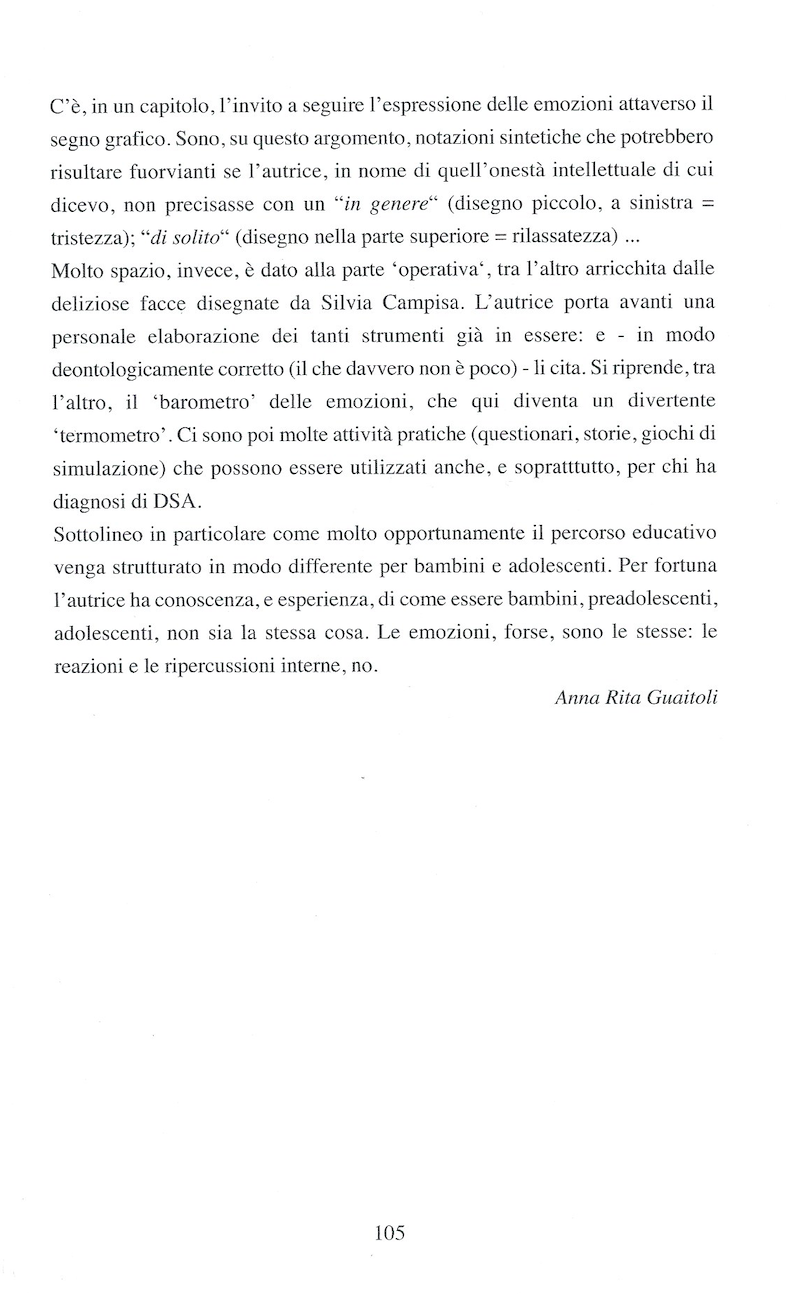 Il libro è completato dai bei disegni di Silvia Campisi che in maniera assai espressiva raffigurano le emozioni primarie, illustrandone i diversi gradi di intensità: 5 carte del termometro delle emozioni e 31 carte delle emozioni, facilmente fotocopiabili in modo da poter essere utilizzate ogni volta che si vuole.