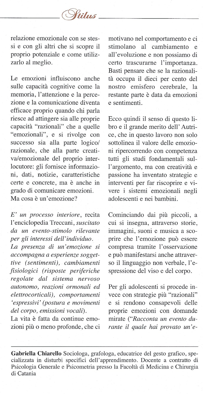 Gabriella Chiarello, sociologa, grafologa, educatrice del gesto grafico, specializzata in disturbi specifici dell’apprendimento, è docente a contratto di Psicologia generale e Psicometria presso la Facoltà di Medicina e Chirurgia dell'Università di Catania.