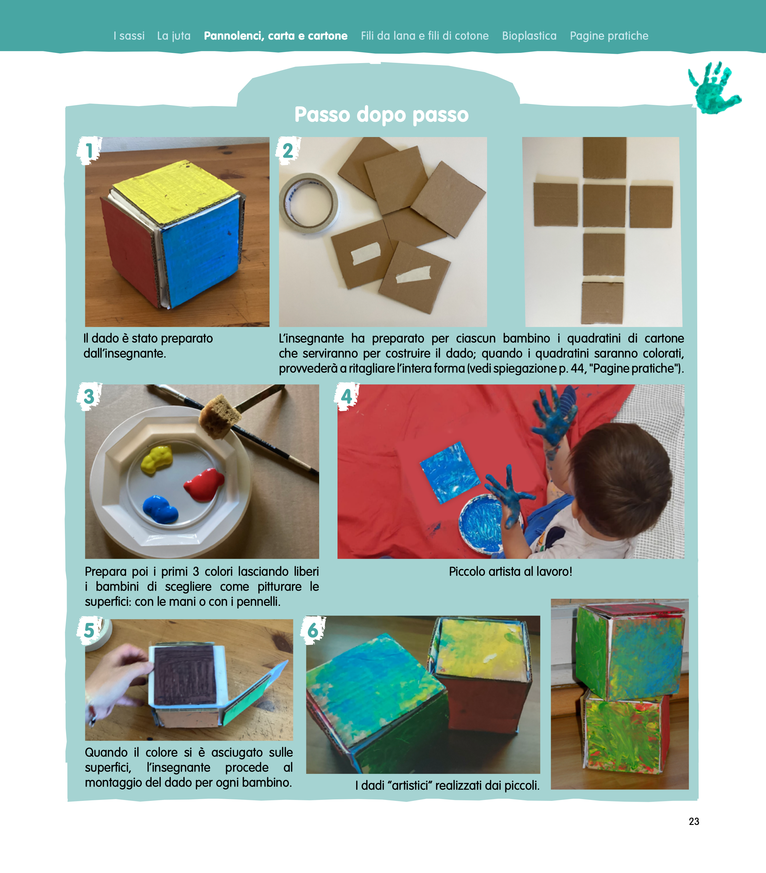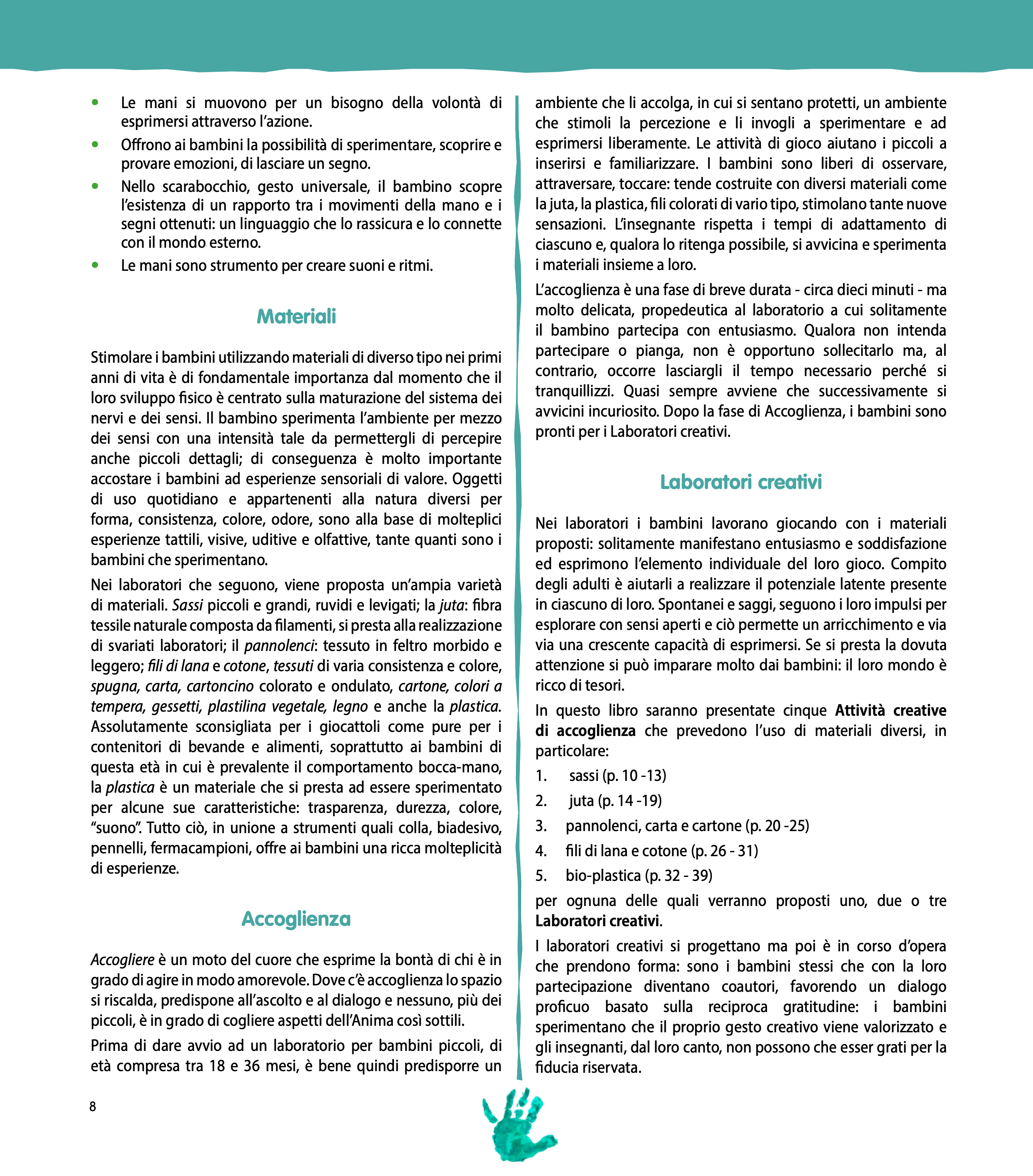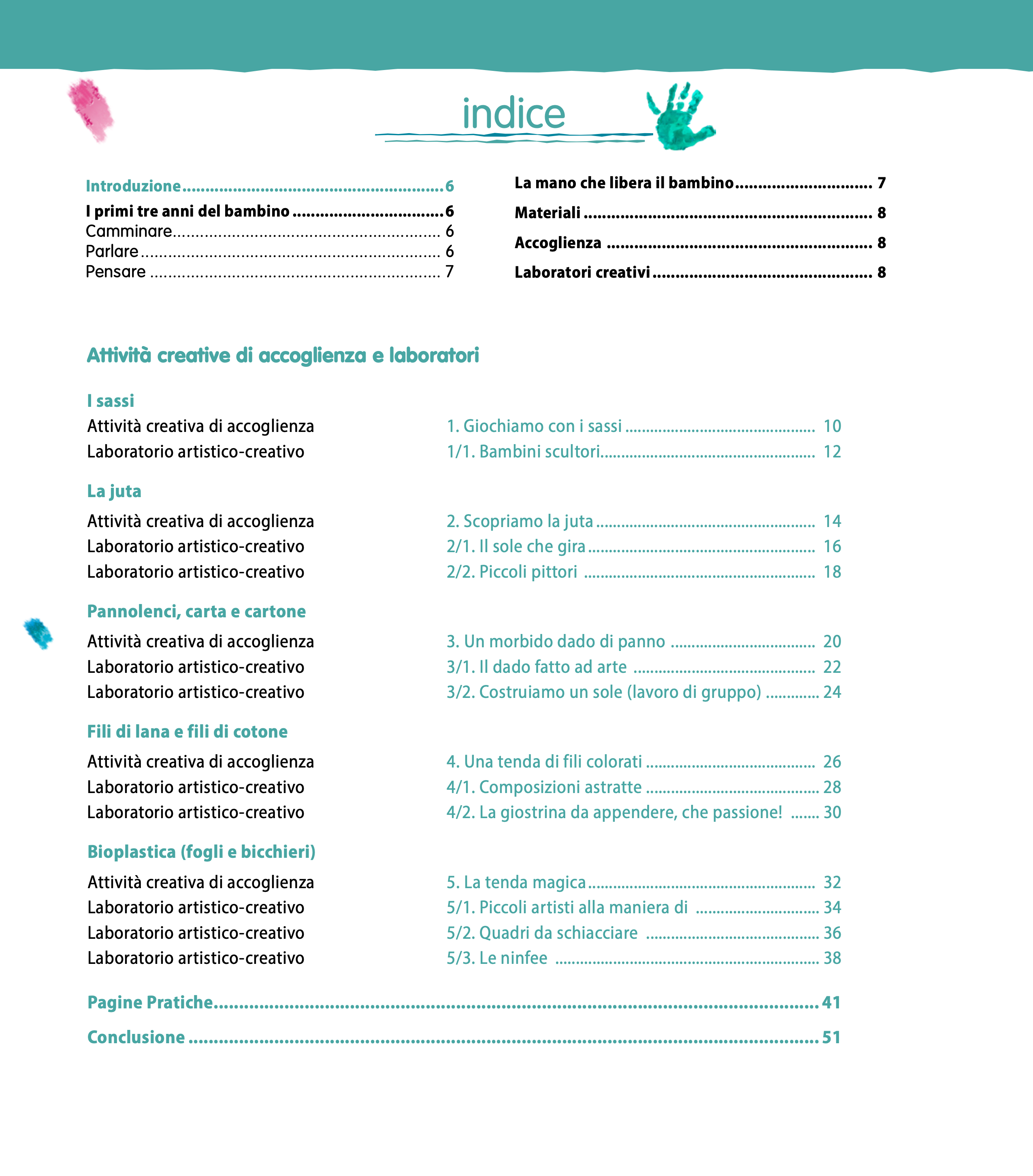 Lo scopo di questo libro è appunto quello di proporre idee e modalità di applicazione accompagnando gli educatori, passo dopo passo, alla realizzazione di laboratori che consentano a bimbi in così tenera età di sperimentare giocando. Attraverso l’utilizzo di diversi materiali, appartenenti alla natura e non solo (sassi, juta, carta, tessuti, gessetti, tempere...), i piccoli hanno l’opportunità di fare esperienze tattili, visive, uditive e olfattive di fondamentale importanza dal momento che proprio in questi anni il loro sviluppo fisico è centrato sulla maturazione del sistema nervoso e sensoriale.