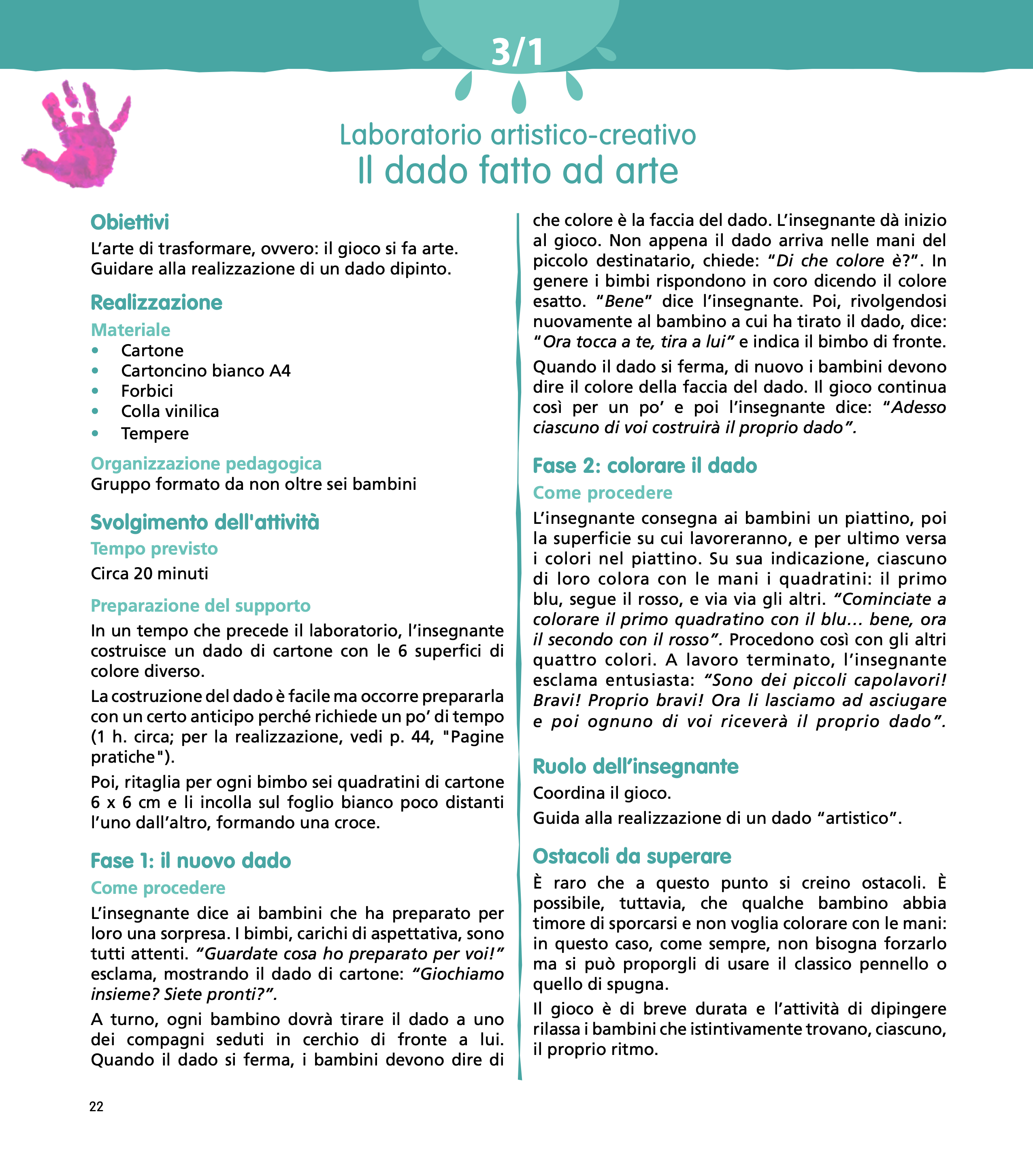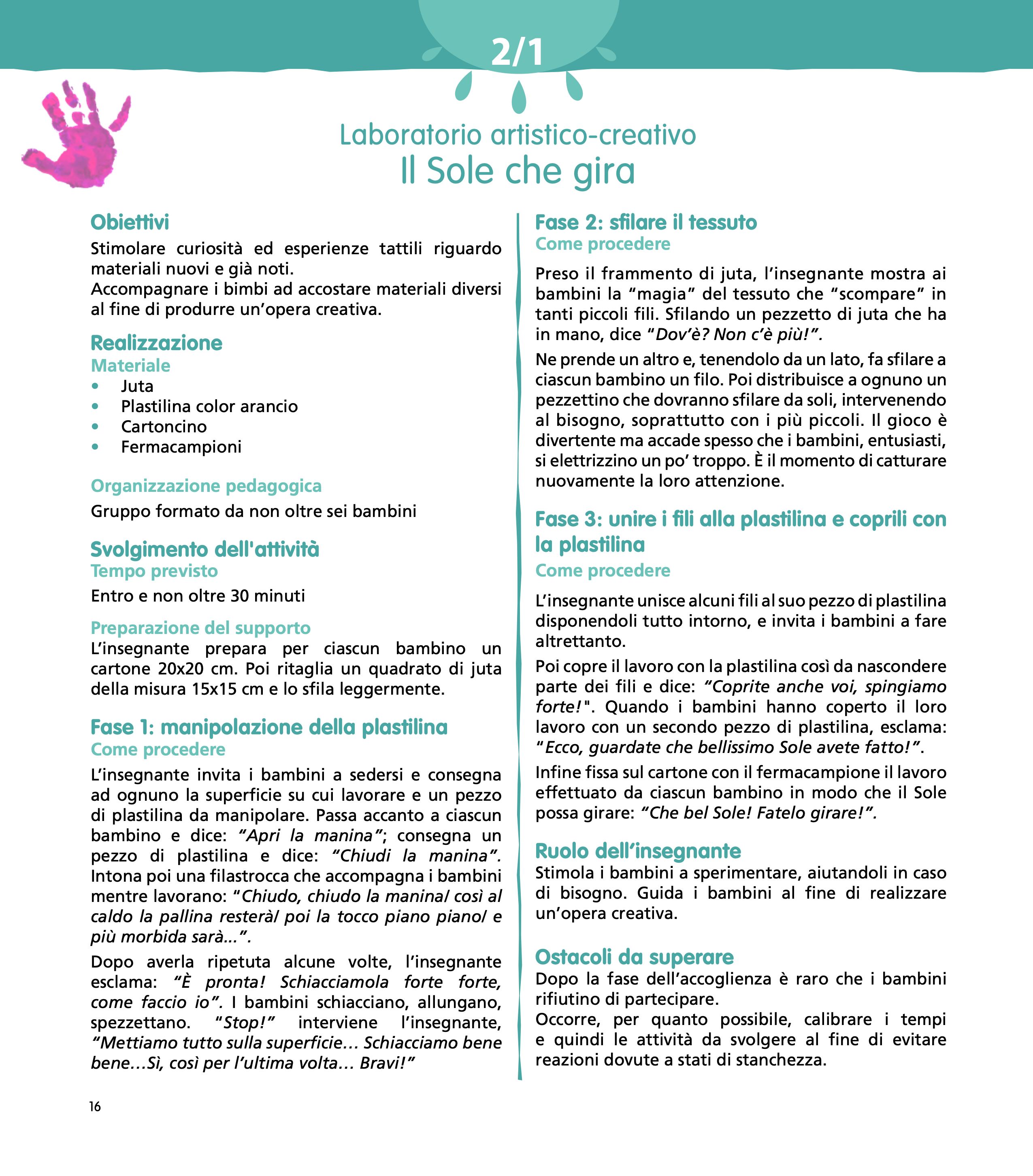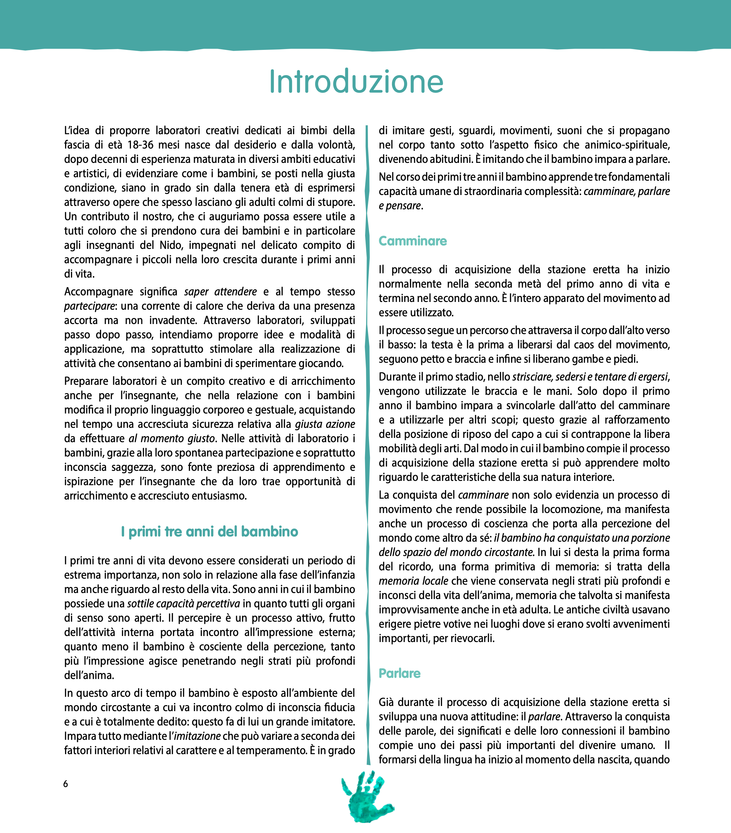 Con Laboratori creativi per il nido, per i piccoli di età compresa tra i 18 e i 36 mesi, la nostra serie di volumi dedicati ai bambini in età pre-scolare si arricchisce e si completa. I primi tre anni di vita sono quelli in cui i bambini possiedono una sottile capacità percettiva che consente loro di sperimentare l’ambiente con un’intensità tale da percepire anche piccoli dettagli; di conseguenza, è molto importante che si accostino ad esperienze sensoriali di valore.
