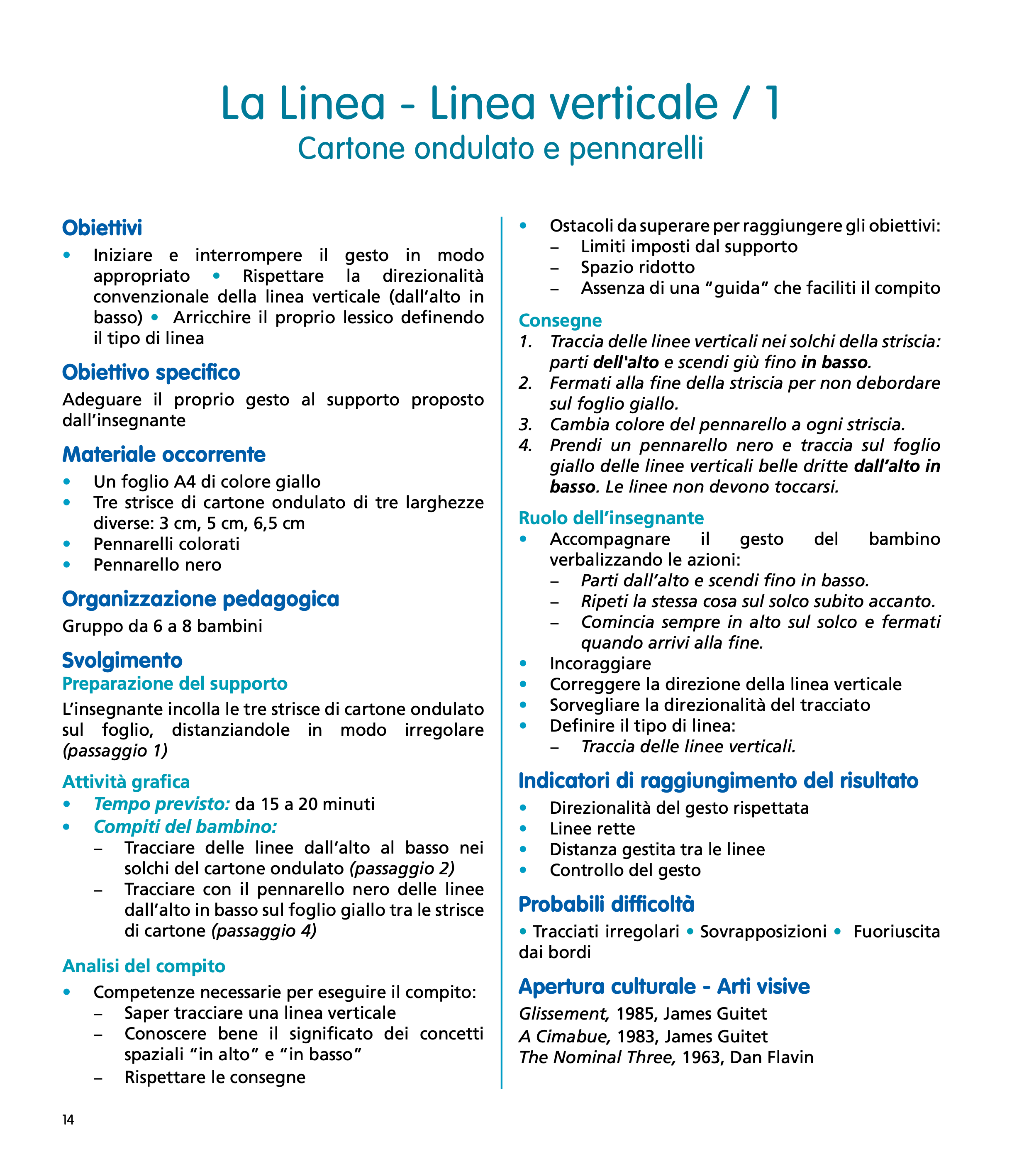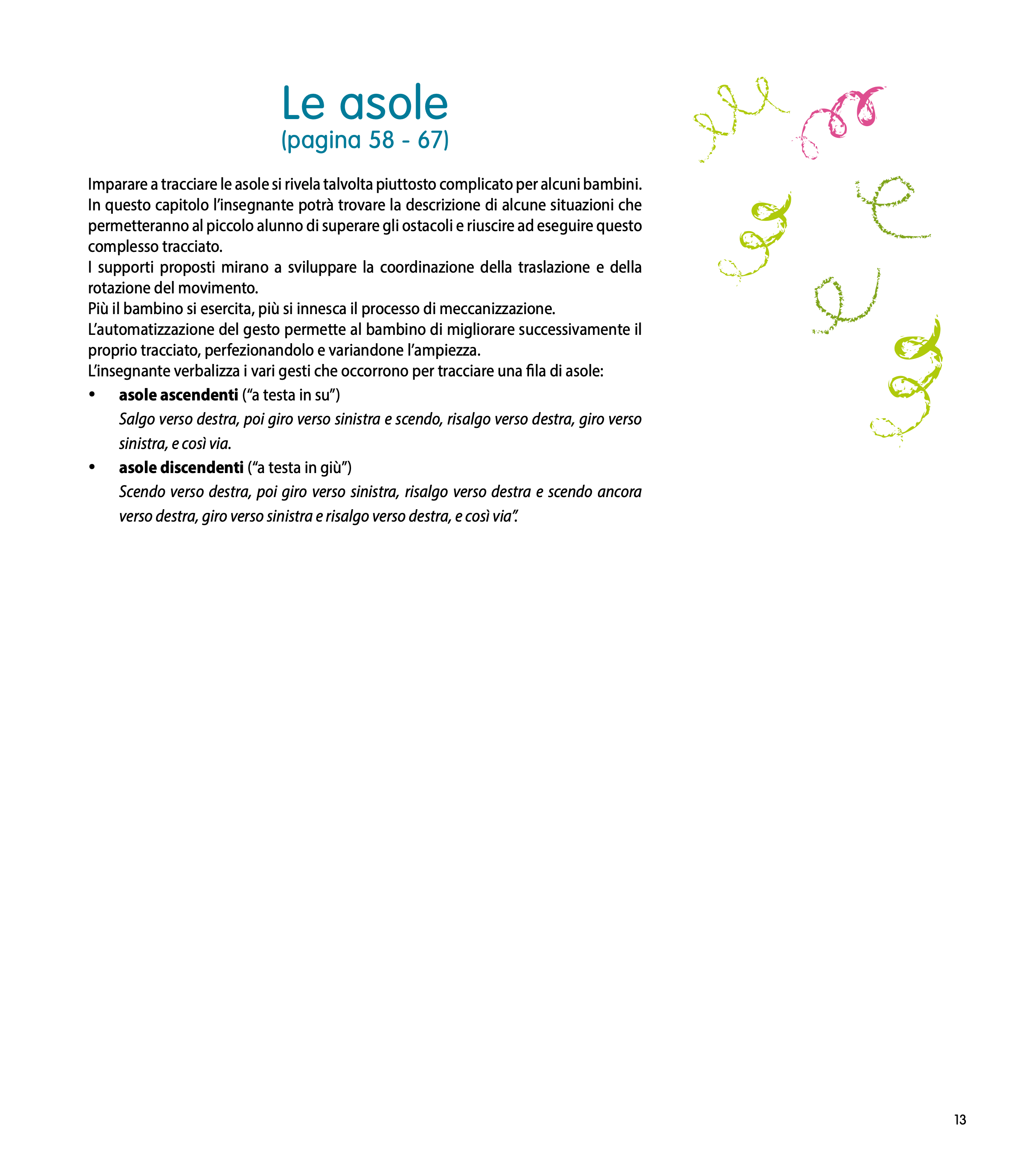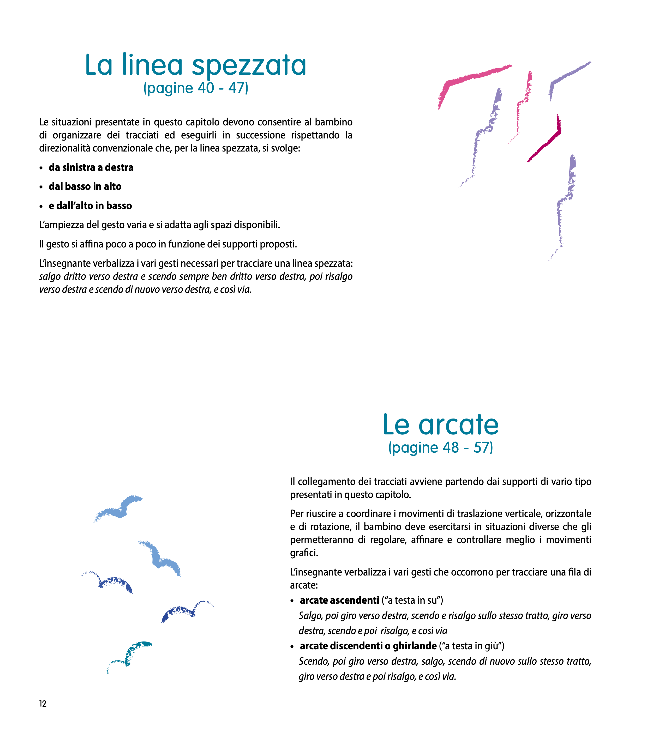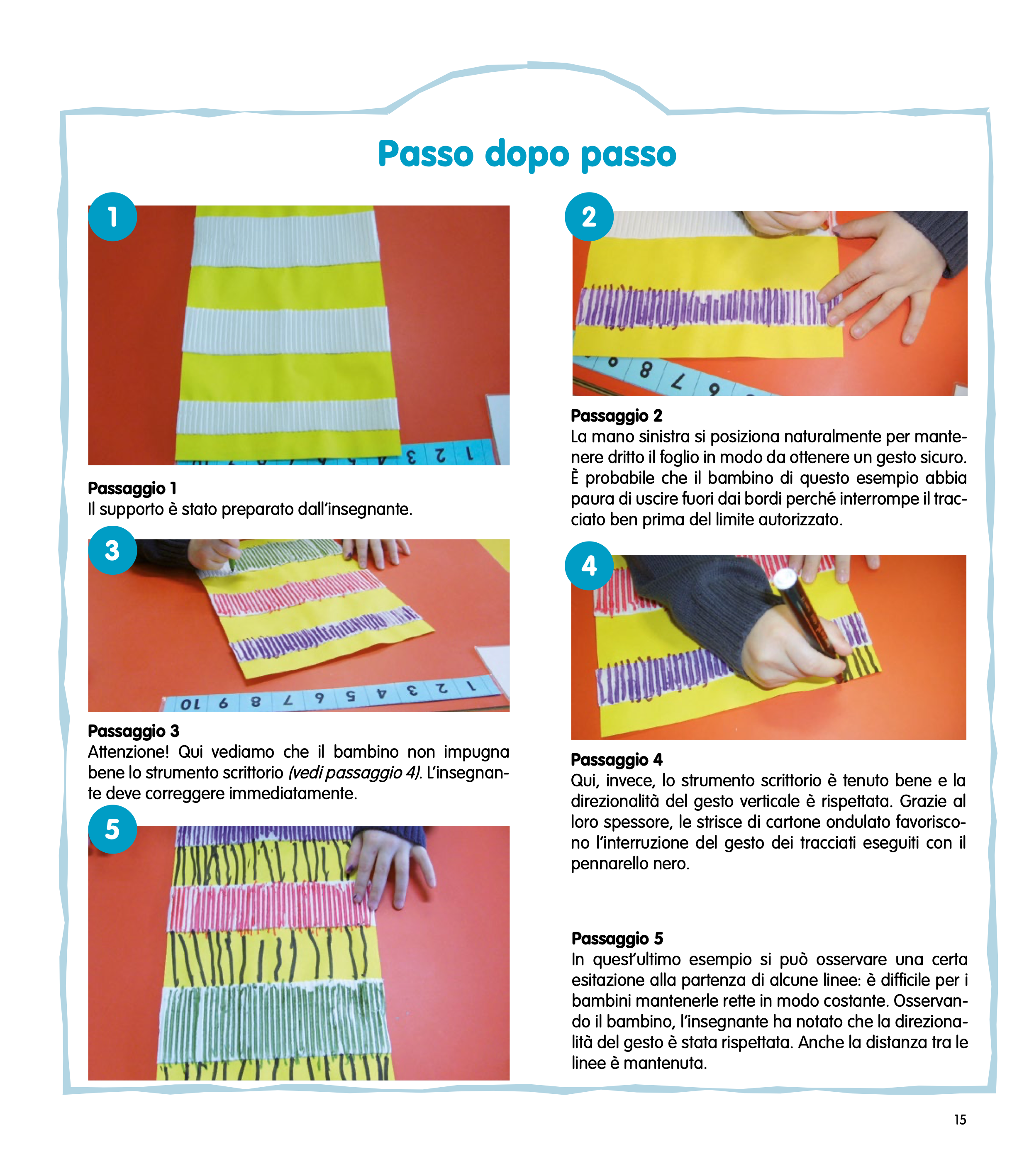 Grazie ad un esercizio sistematico e regolare, il bambino viene guidato passo dopo passo per prepararsi ad affrontare la scrittura corsiva quando giungerà il momento di fare il suo ingresso nella scuola elementare. Le attività proposte sono presentate sempre su una doppia pagina: a sinistra, si trova tutto ciò che riguarda lo svolgimento dell’attività: obiettivi, compiti del bambino, ruolo dell’insegnante, indicatori di raggiungimento del risultato, materiale occorrente, tempo previsto… A destra, una serie di fotografie illustrano i vari passaggi, dalla preparazione del supporto alla fine del compito.