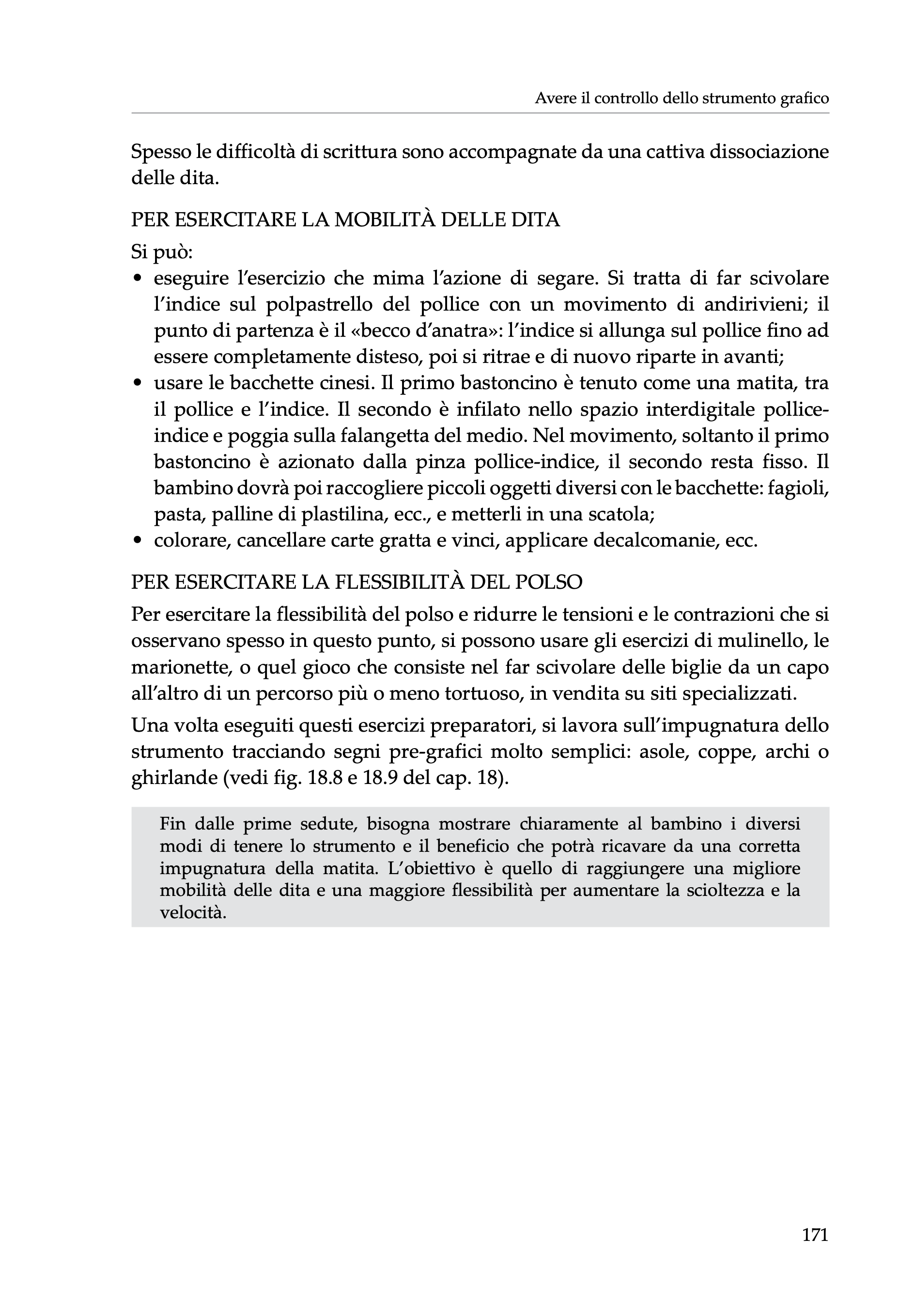 La grafoterapia ripercorre il lavoro pedagogico che normalmente precede l’apprendimento della scrittura e mette a disposizione del bambino il “modello calligrafico” che egli poi personalizzerà a suo piacimento: non è infatti minimamente ipotizzabile praticare una rieducazione selvaggia imponendo al bambino una scrittura che non gli appartiene.