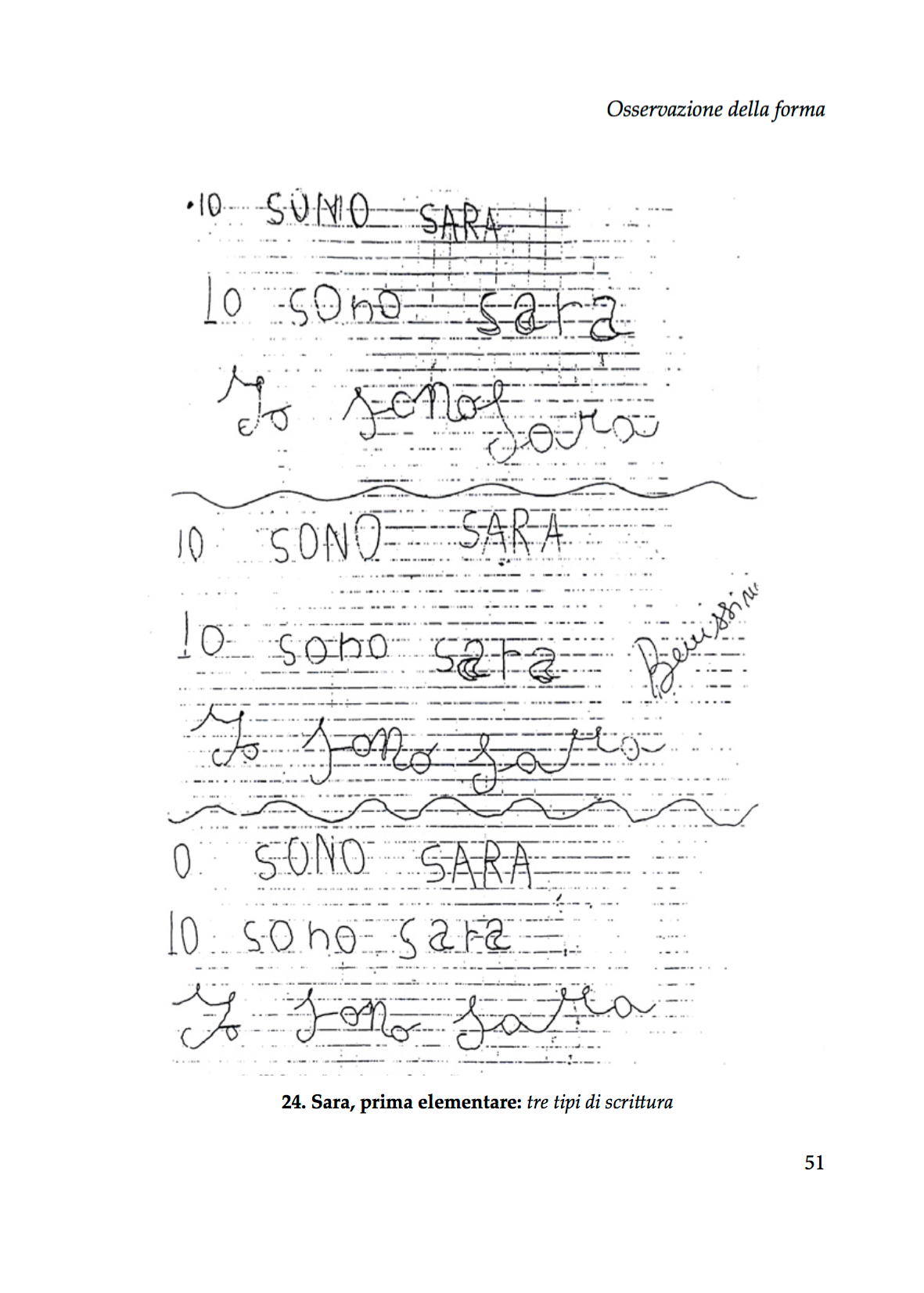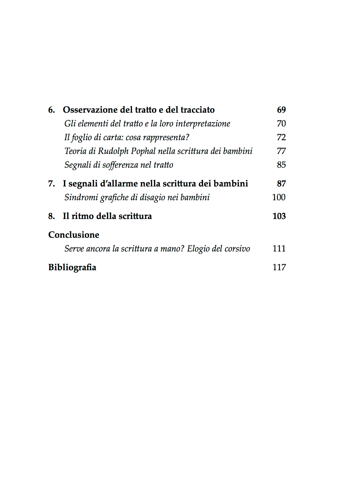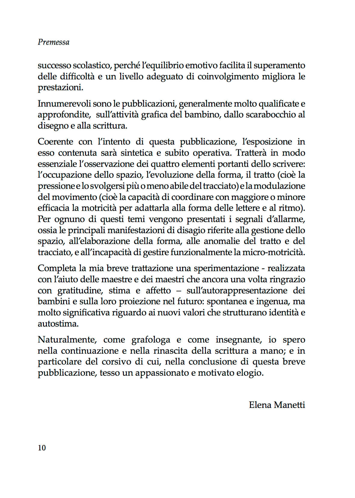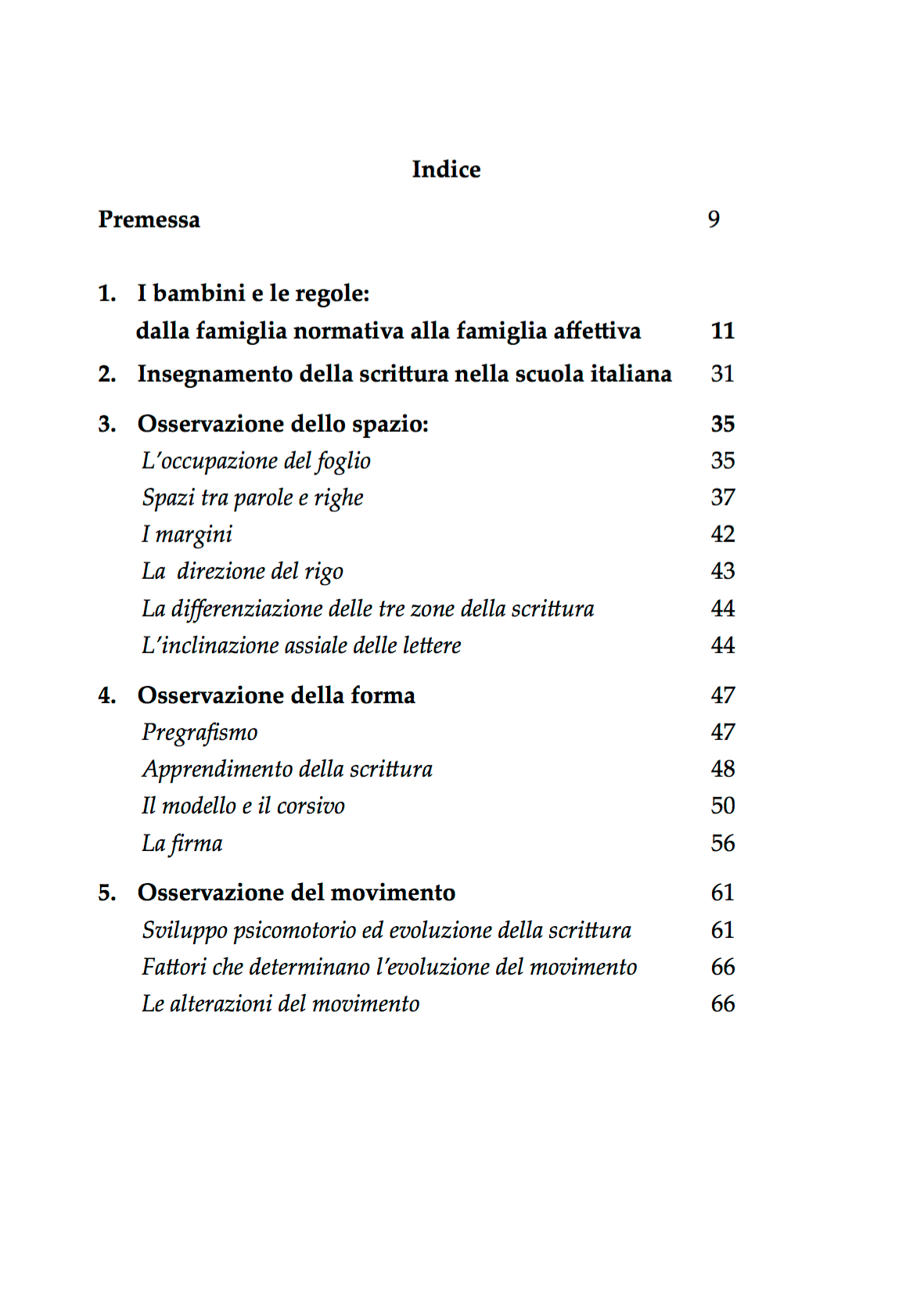 Il libro affronta il tema dell’importanza della scrittura manuale nella scuola primaria, osservando nei piccoli allievi il modo di occupare lo spazio, lo svolgersi e la qualità del tracciato, l’elaborazione della forma e lo sviluppo della motricità. Importanti i “segnali di allarme” reperibili nella scrittura dei bambini di oggi, i quali hanno grande difficoltà ad accettare la disciplina e poca capacità di concentrazione, spesso in competizione con se stessi e gli altri.