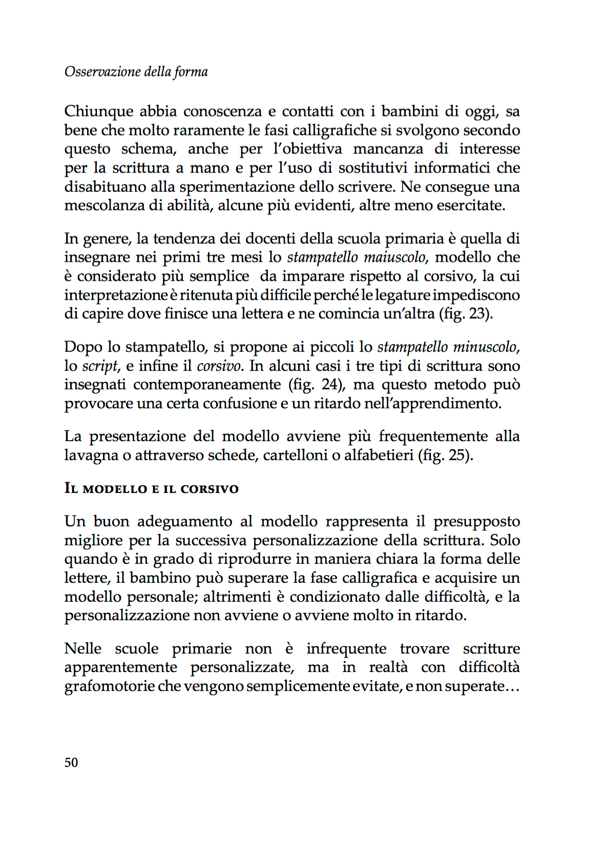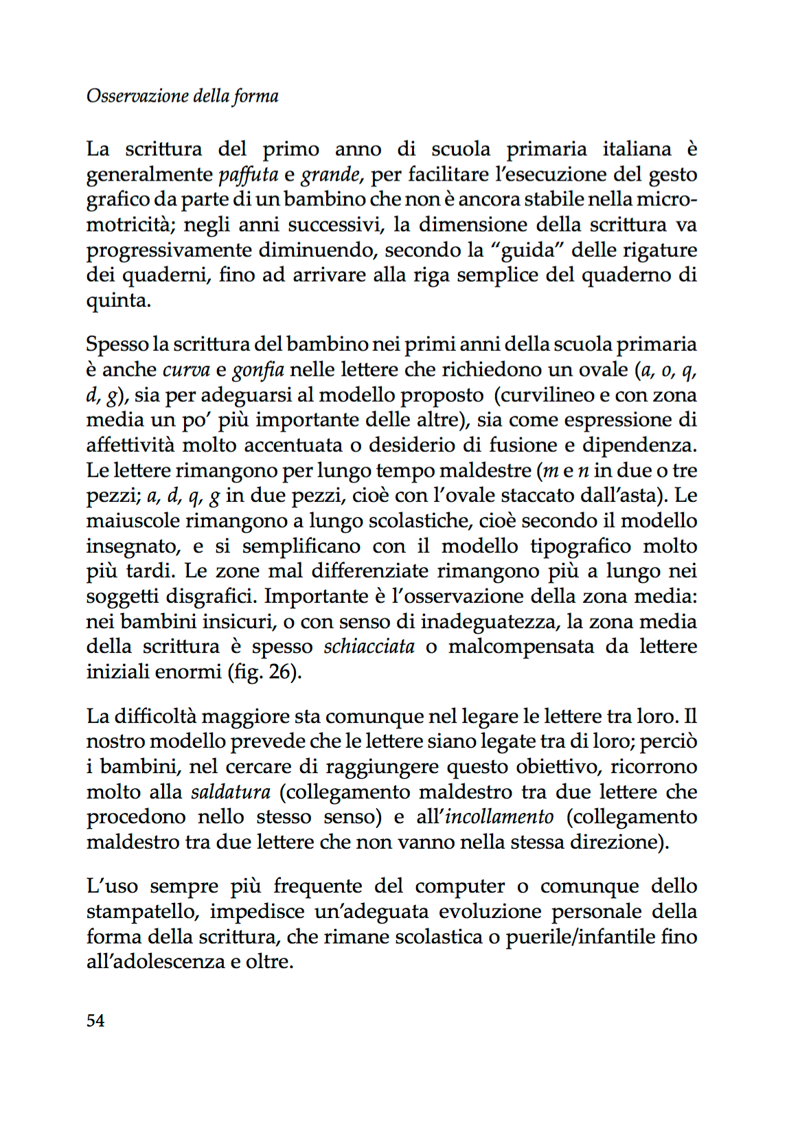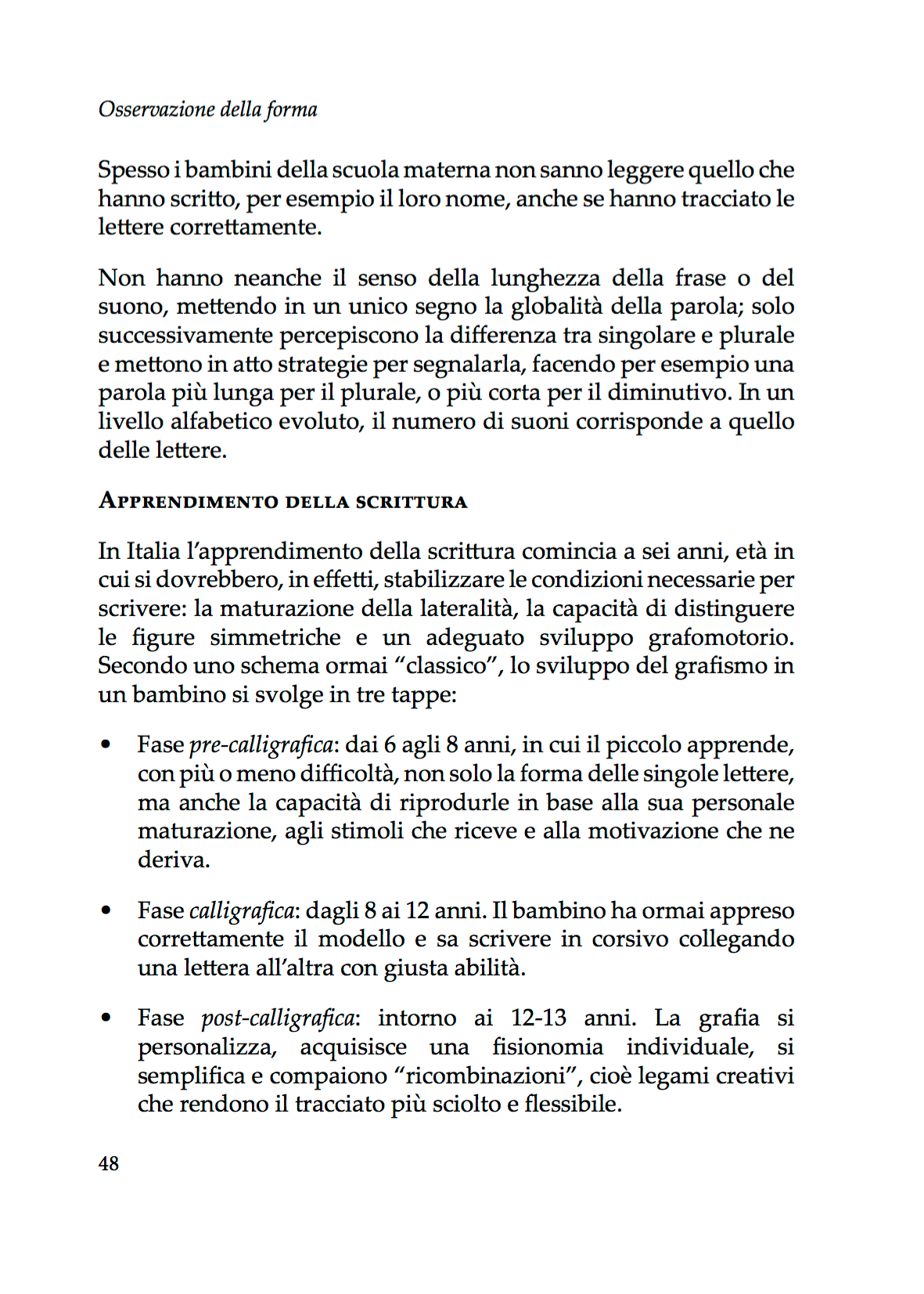 Il libro affronta il tema dell’importanza della scrittura manuale nella scuola primaria, osservando nei piccoli allievi il modo di occupare lo spazio, lo svolgersi e la qualità del tracciato, l’elaborazione della forma e lo sviluppo della motricità. Importanti i “segnali di allarme” reperibili nella scrittura dei bambini di oggi, i quali hanno grande difficoltà ad accettare la disciplina e poca capacità di concentrazione, spesso in competizione con se stessi e gli altri.