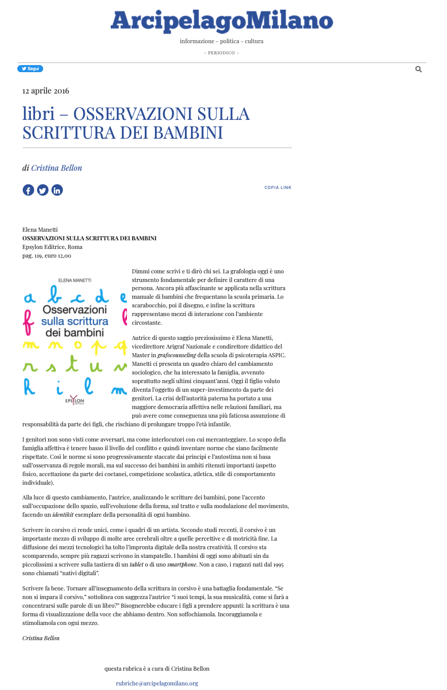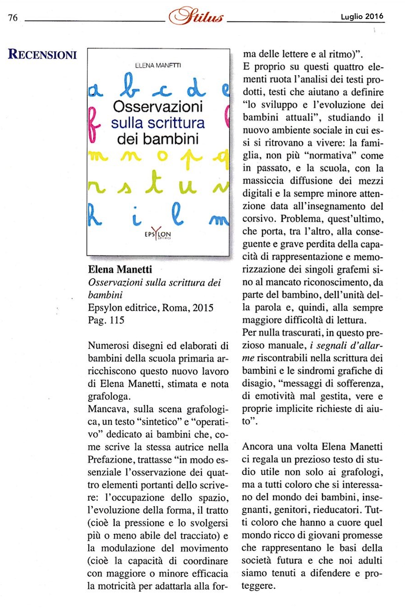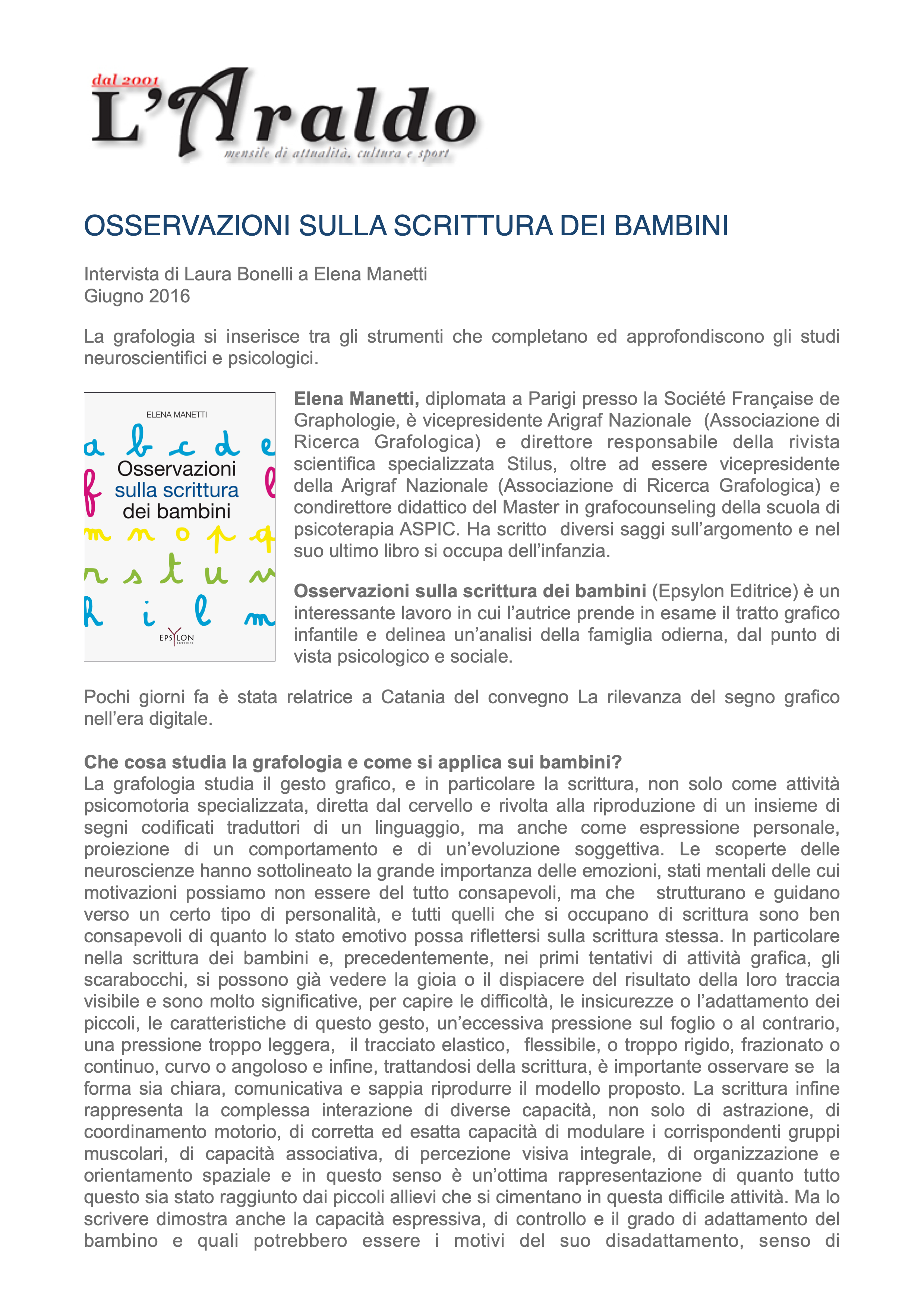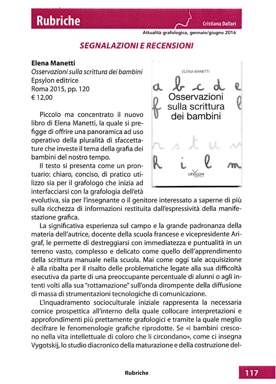 Un libro particolarmente utile e interessante per chi si dedica ai problemi e alle risorse dell’età dello sviluppo, non solo quindi per i grafologi ma rivolto a tutti coloro che si occupano di bambini, soprattutto a maestre e maestri della scuola primaria.