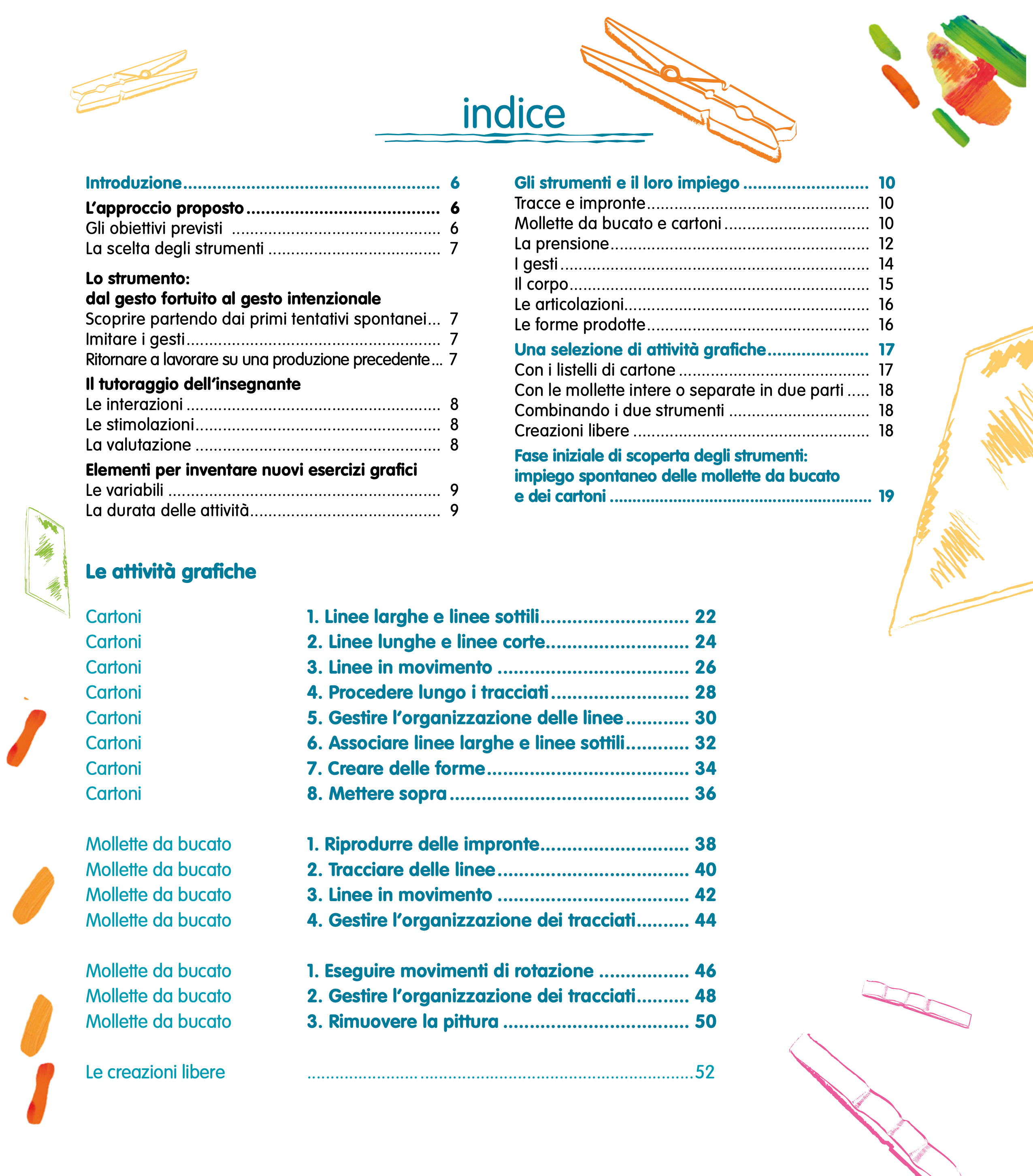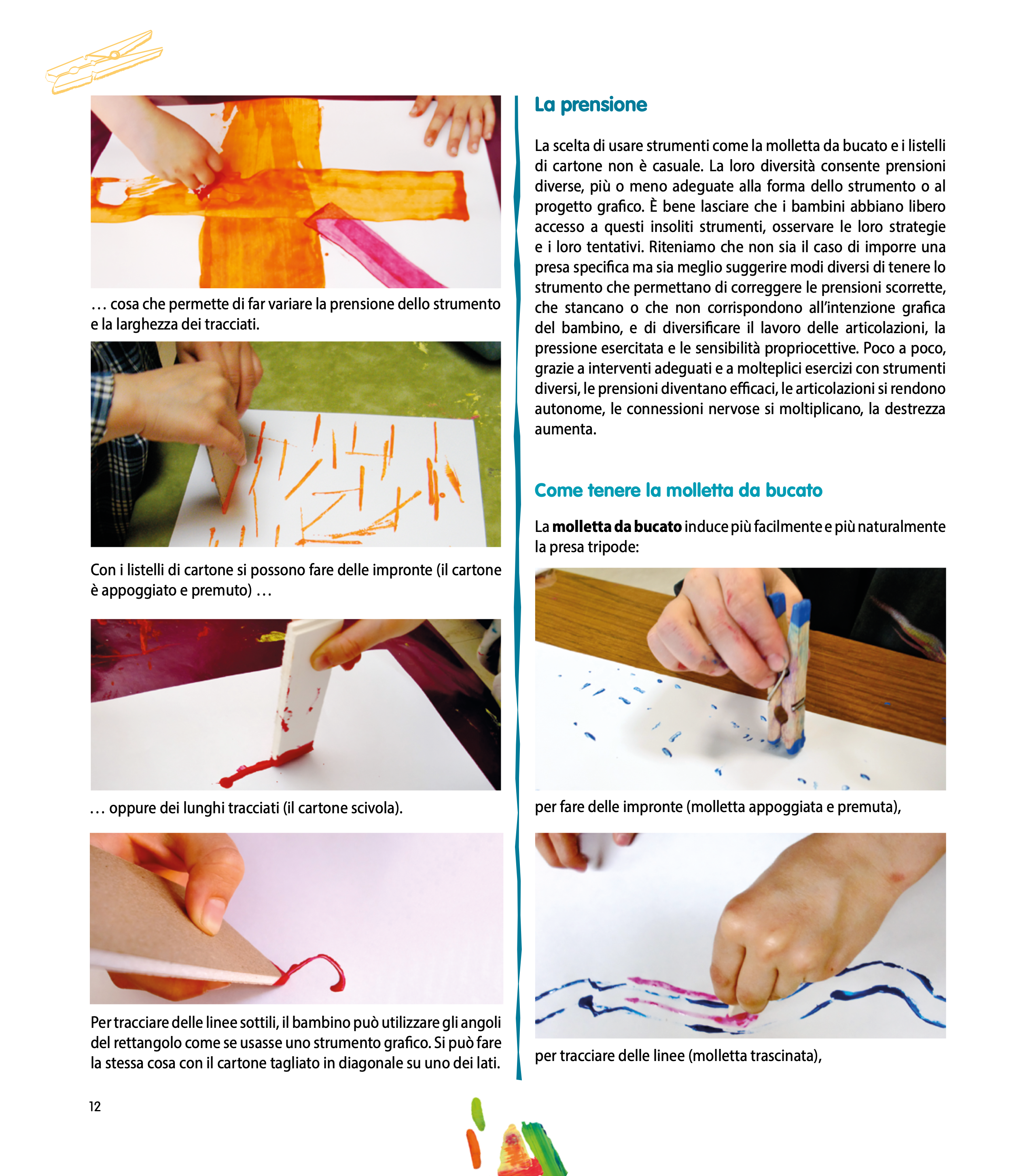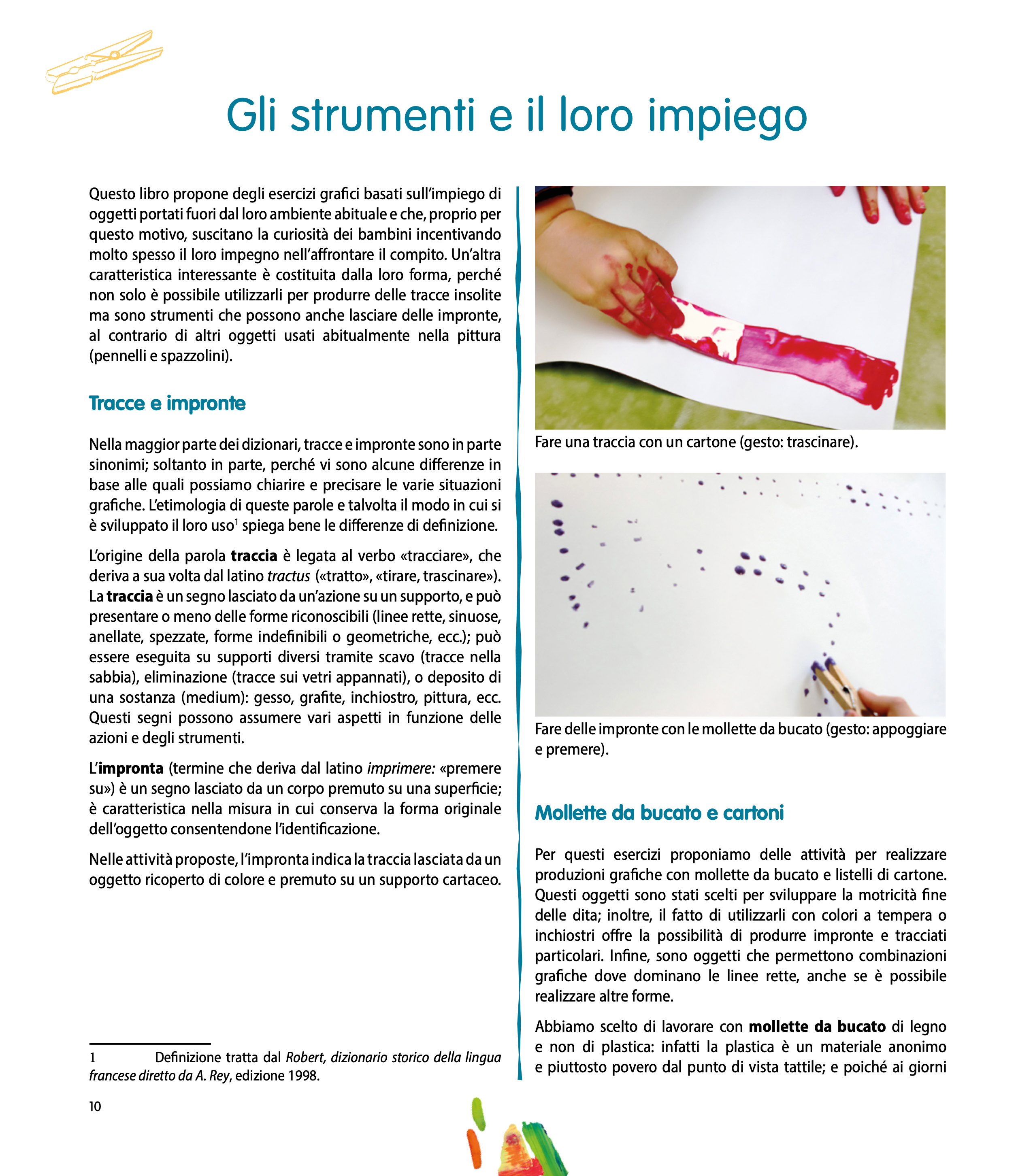 L’obiettivo di “Strumenti grafici insoliti” è proporre attività grafiche utilizzando strumenti della vita quotidiana facilmente reperibili: nel primo libro i protagonisti erano tappi e vasetti, qui sono invece le mollette da bucato e i cartoni...