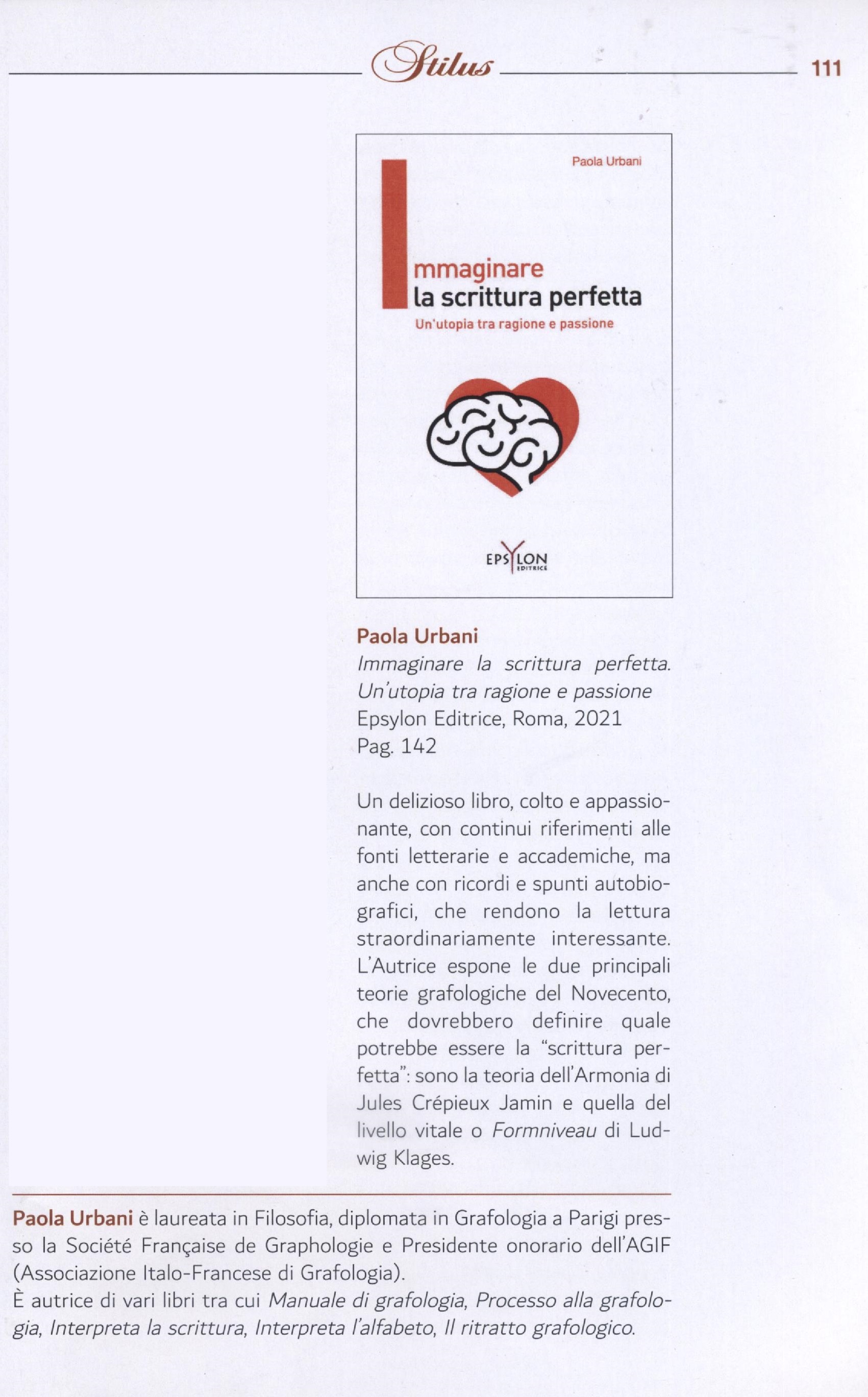 Paola Urbani è laureata in filosofia, diplomata in grafologia a Parigi presso la Société Française de Graphologie e Presidente onorario dell’AGIF (Associazione Italo-Francese di Grafologia). È autrice di vari libri tra cui Manuale di grafologia (Newton Compton), Processo alla grafologia (Dedalo), Interpreta la scrittura (Francoangeli), Interpreta l’alfabeto (Francoangeli), Il ritratto grafologico (Biblioteca d’Orfeo), Test proiettivi, cosa sono e cosa dicono di noi (Epsylon Editrice), Effetto-nome. Come il nome ci cambia la vita (Epsylon Editrice).
