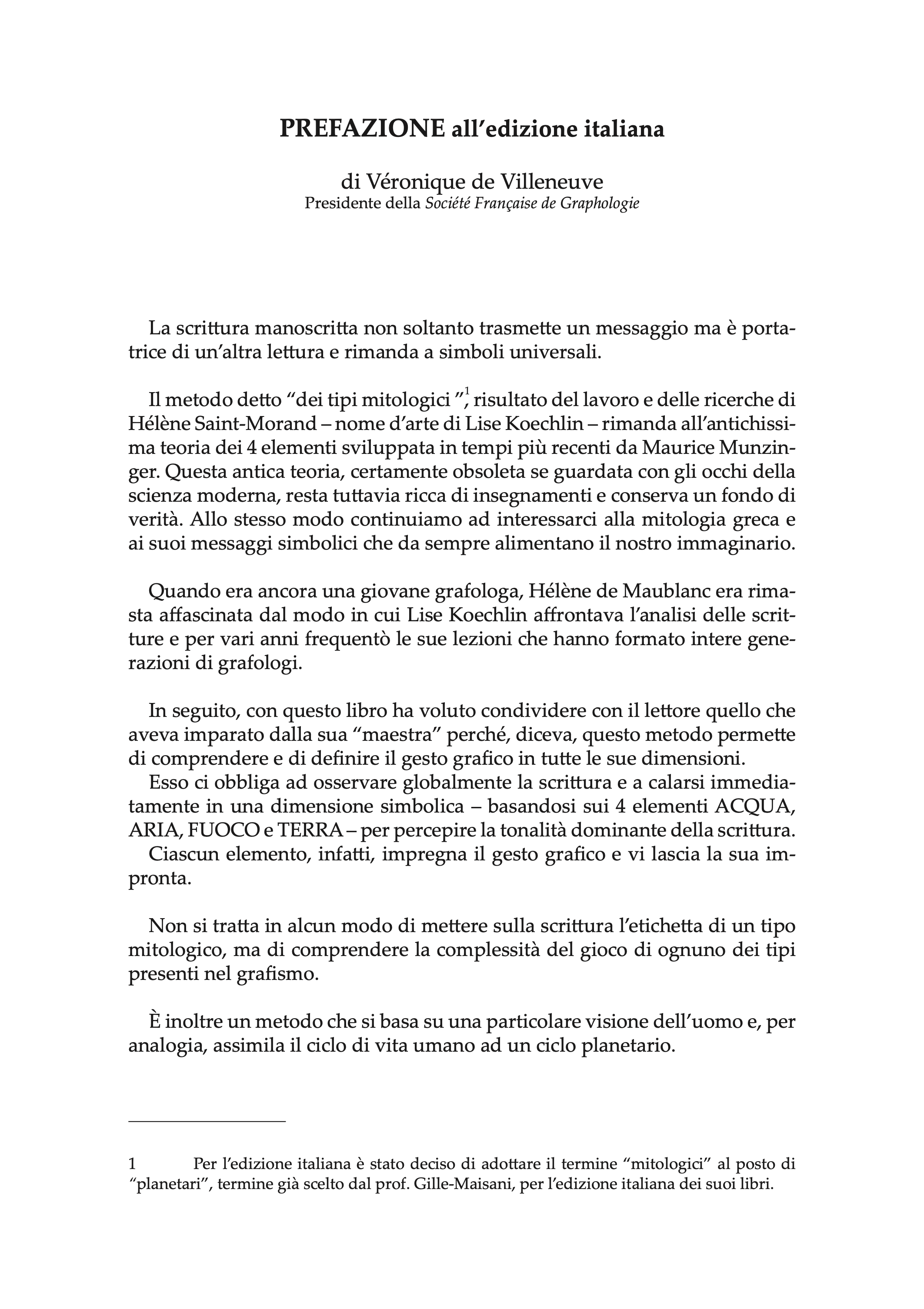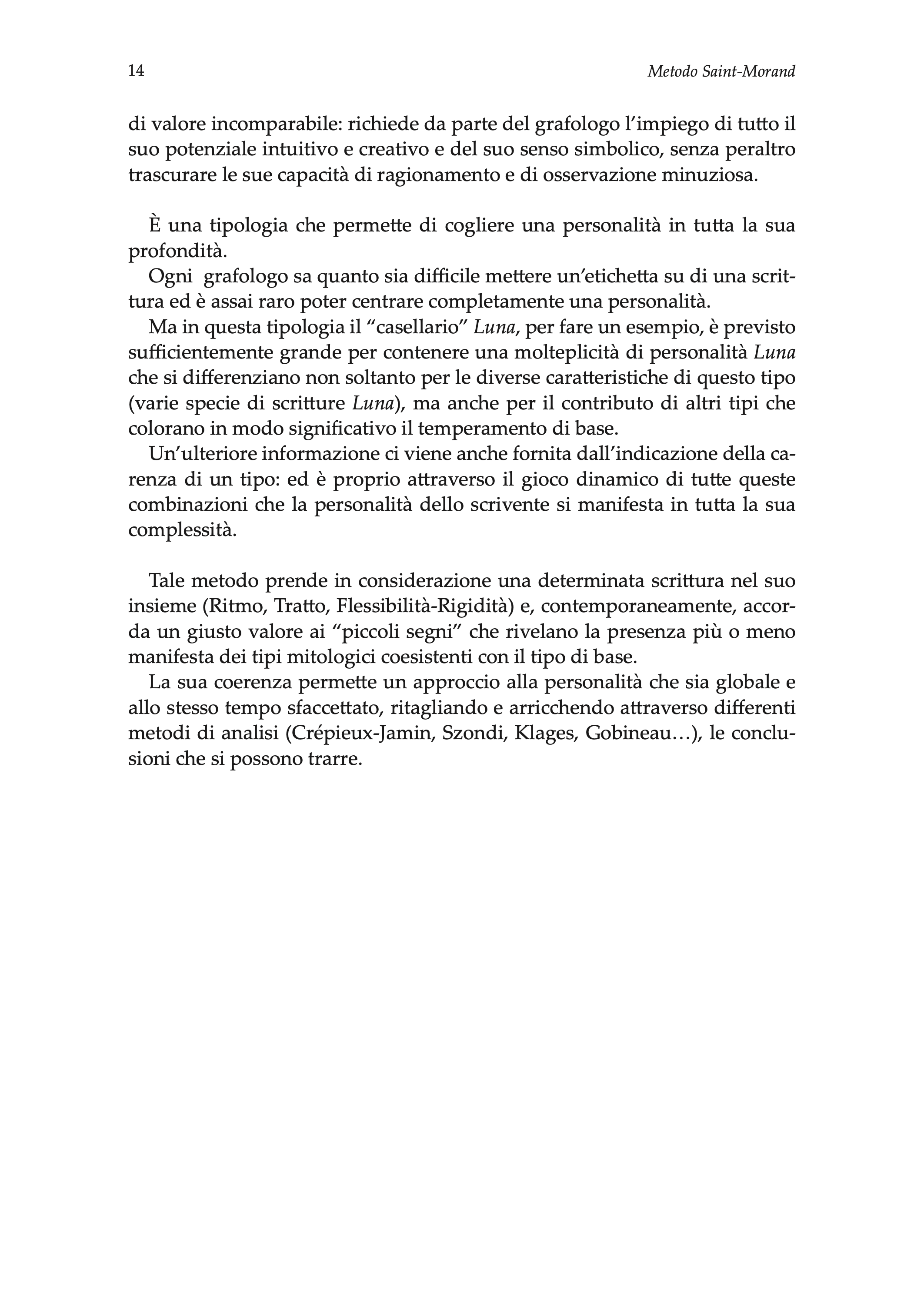La coerenza del metodo, colto e profondo, permette un approccio dettagliato e insieme globale della personalità: esso si ispira agli archetipi, immagini primordiali e universali, presenti fin dai tempi più remoti della storia dell’umanità. Nel libro sono descritti otto tipi mitologici: Luna, Venere, Giove, Sole, Marte, Mercurio, Saturno, Terra e ogni tipo viene descritto in base alle caratteristiche tecniche grafologiche (spazio, movimento, forma, tratto, tensione, dimensione direzione, velocità, continuità e temperamento ippocratico), ma anche attraverso le sue caratteristiche psicologiche con sindromi riferite all’intelligenza, l’attività e l’affettività. Ogni tipo è esemplificato da molte scritture alle quali, in questa edizione italiana, sono stati aggiunti esempi di scritture italiane appartenenti a personaggi più o meno noti, attuali o dal recente passato.