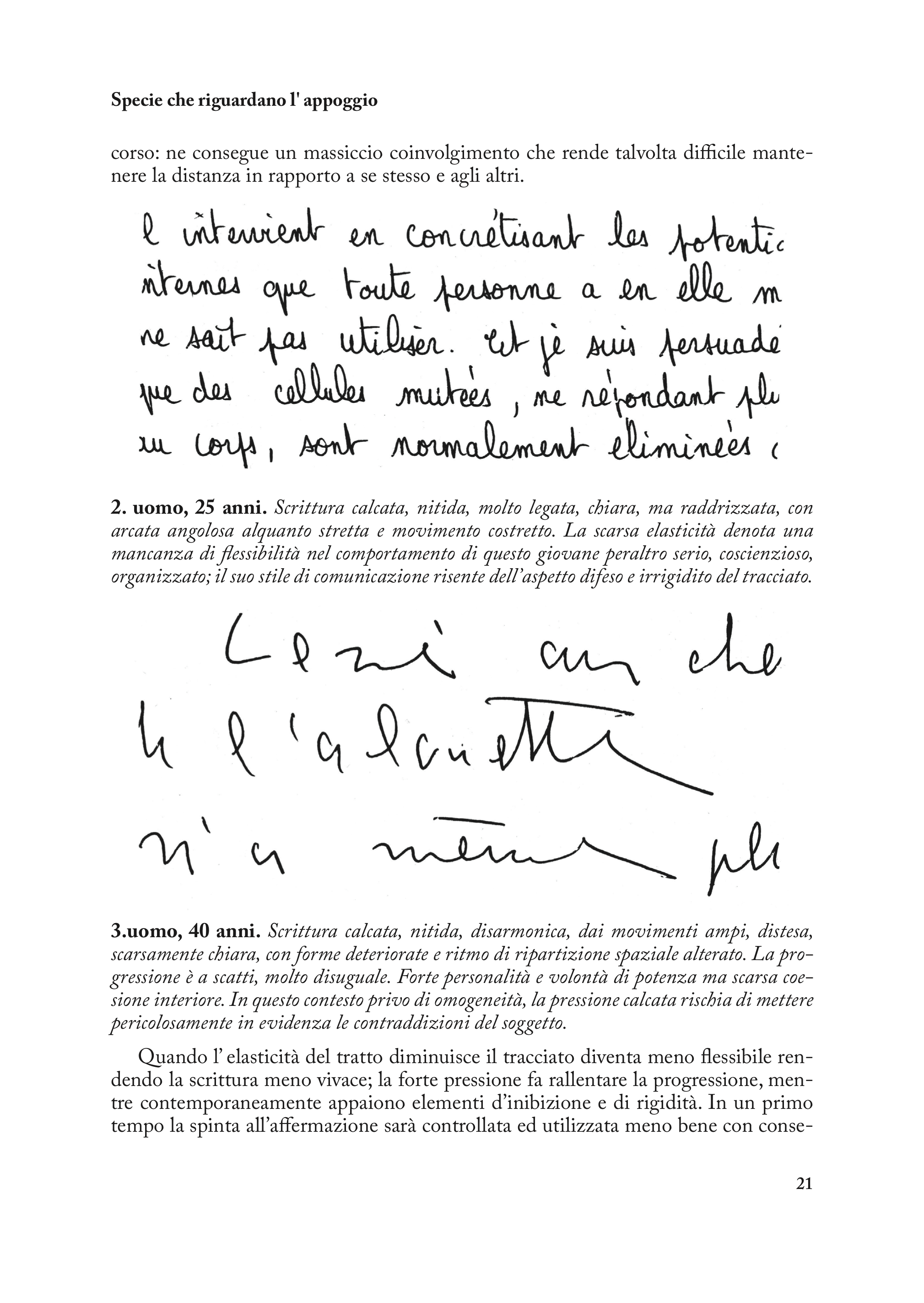 Il libro si divide in due parti: la prima studia le basi dell’analisi grafologica; la seconda affronta l’evoluzione della scrittura, la disgrafia, i rapporti tra forma e movimento, la metodologia e la scrittura dei mancini.