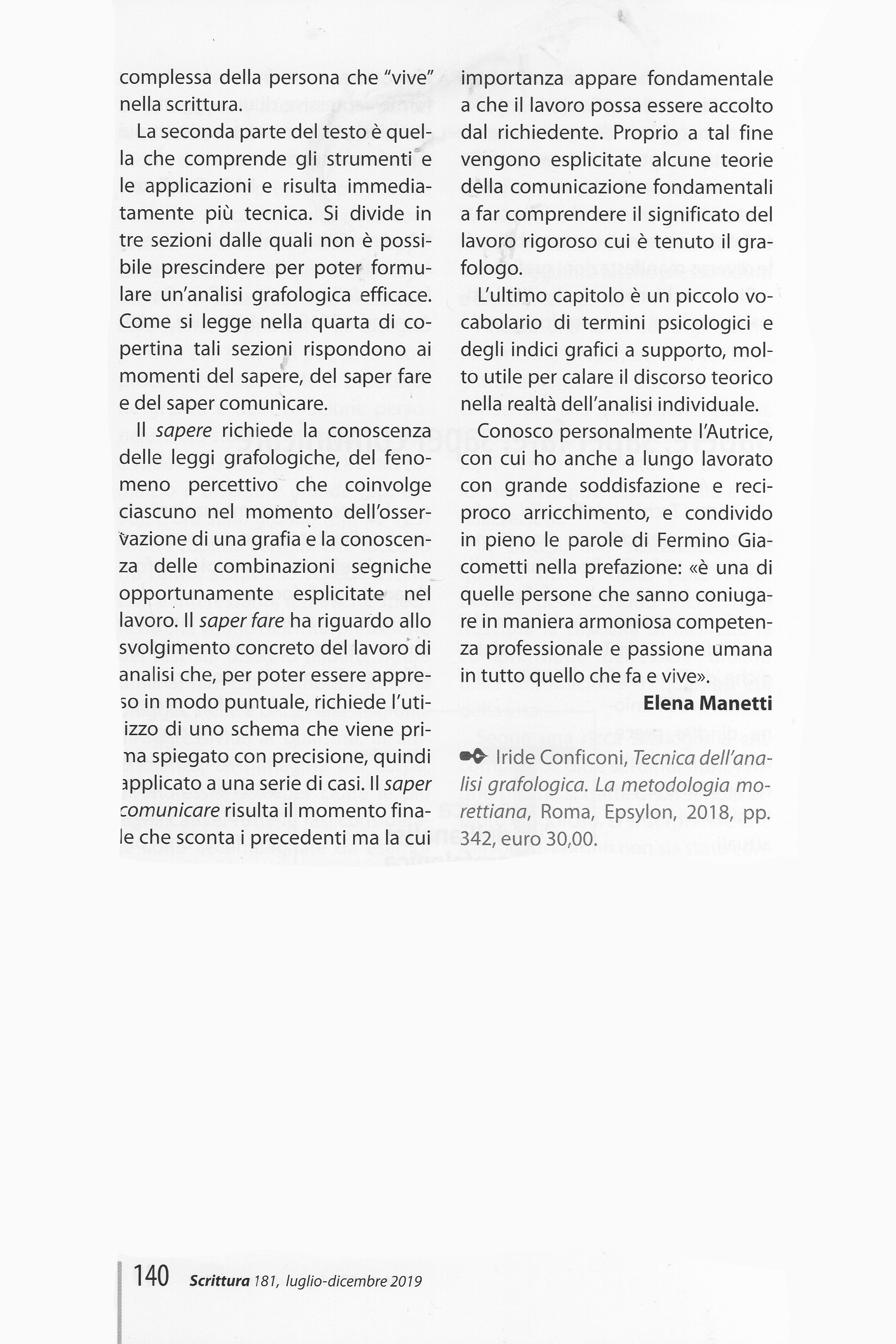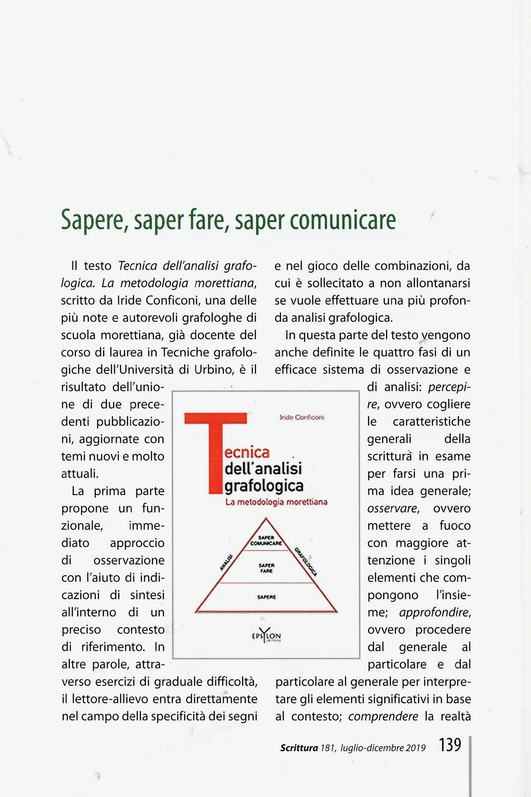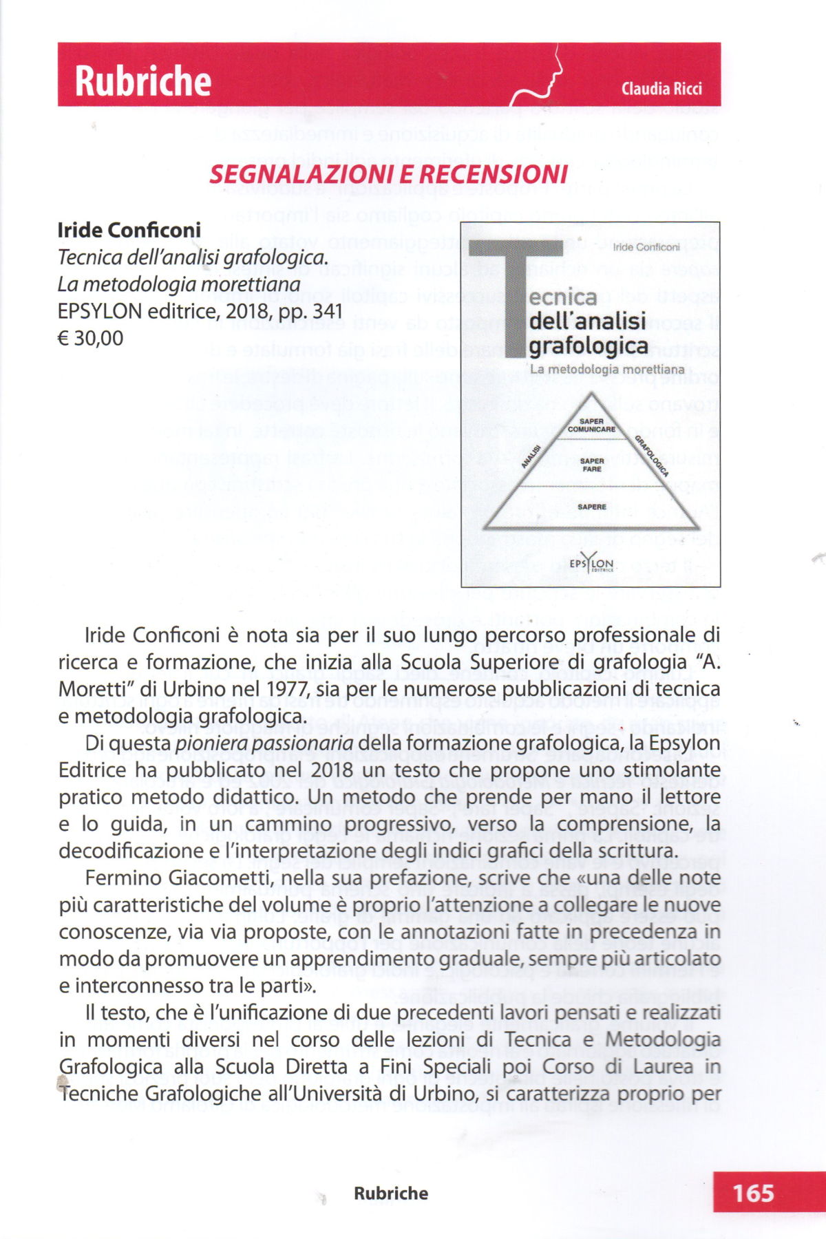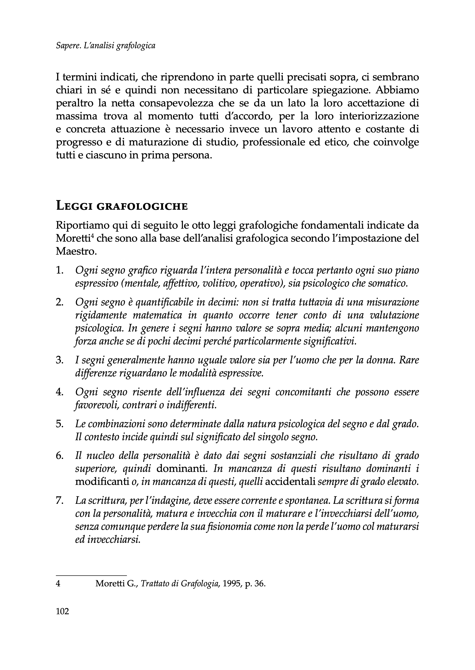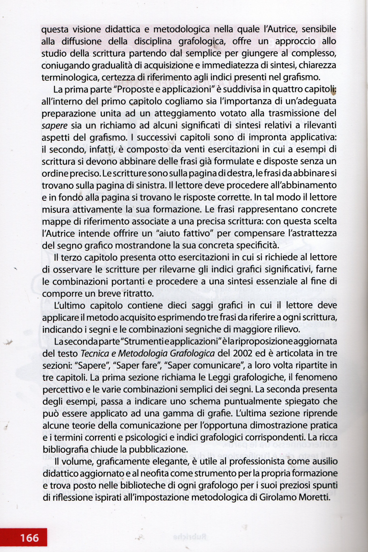 Il libro, frutto di una lunga esperienza didattica svolta per vent’anni dall’autrice presso l’Università di Urbino, è un metodo didattico per lo studio della grafologia morettiana spiegato in modo graduale, rigoroso e corredato da molte esercitazioni pratiche affinché il lettore possa comprendere la complessità della scrittura ed esaminarla nei suoi diversi aspetti.