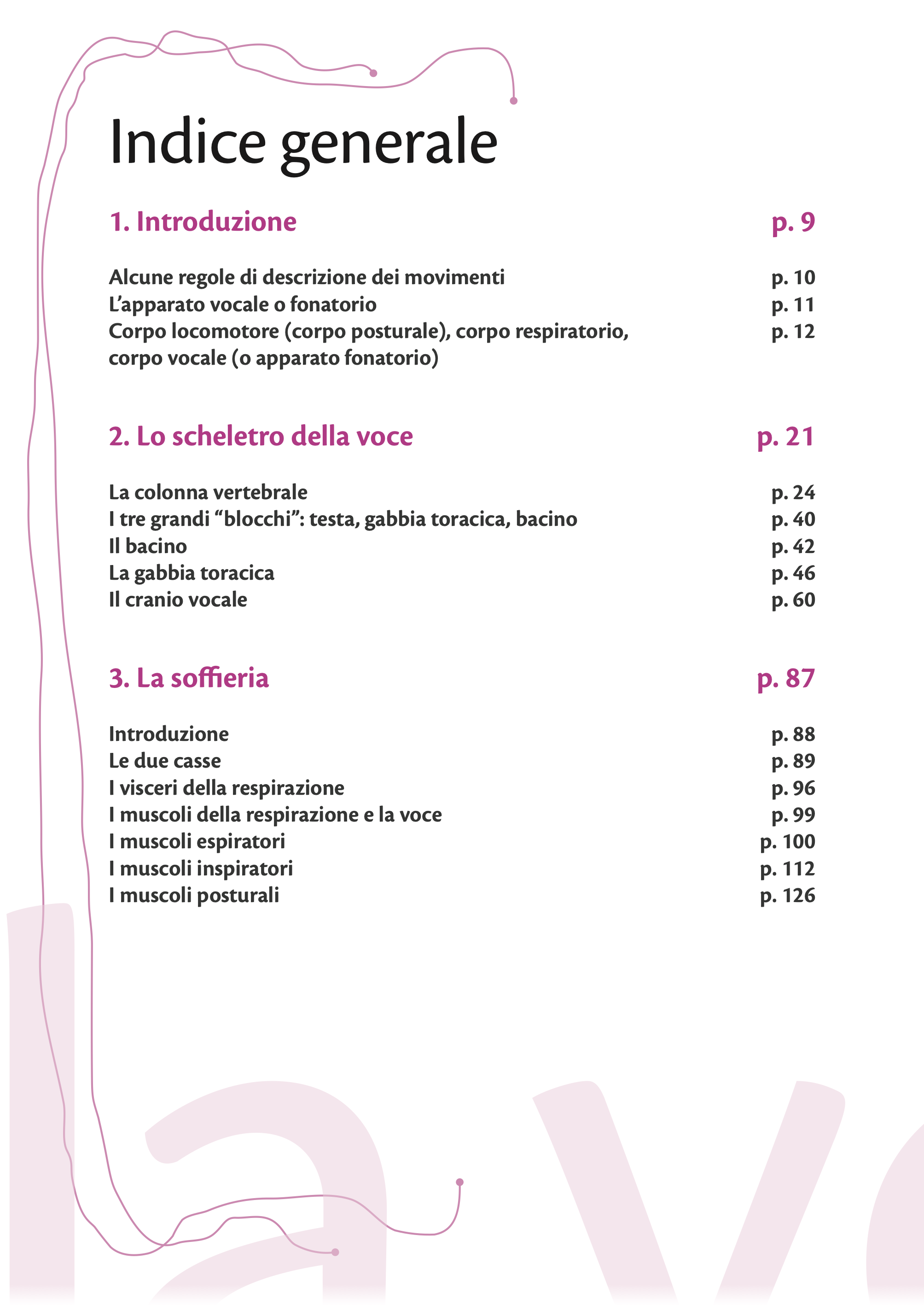 Il libro propone semplici esercizi e tecniche per aumentare il flusso dell’aria e la potenza, la postura corretta, la posizione della lingua, il rilassamento della mandibola e la tonicità del palato molle, consentendo così di organizzare il lavoro vocale partendo dall’anatomia: scegliere un esercizio anziché un altro sapendo come e perché quel particolare esercizio permetterà di ottimizzare una determinata parte della struttura.