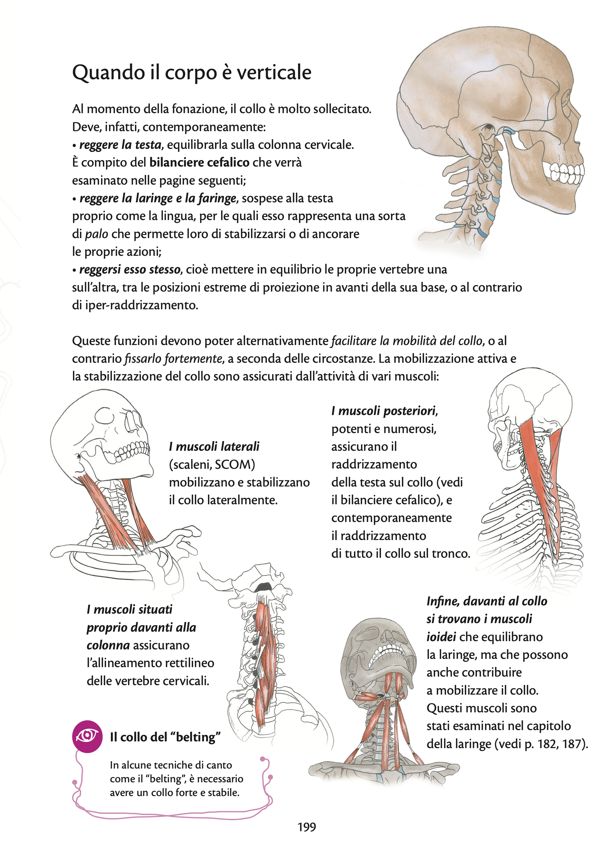 In linea con i volumi di Anatomia per il movimento, quest’opera riccamente illustrata presenta uno studio dinamico, integrato delle strutture fisiche del tratto vocale e la loro relazione funzionale con tutto il sistema neuromuscolare. Dall’esame delle singole ossa e muscoli della testa e del collo, alla complessa struttura delle spalle, ai muscoli addominali e al bacino, gli autori spiegano come ogni parte del corpo si muove, vibra e sostiene la creazione della voce di ciascuno di noi. Con l’aiuto di disegni dettagliati e un testo chiaro e conciso, esaminano gli elementi che compongono la laringe e la faringe, gli effetti delle tensioni muscolari sulle corde vocali, il corretto allineamento del cranio, della cassa toracica e del bacino, la profonda relazione tra il respiro e la voce, e il complesso ruolo del diaframma, del palato molle, delle labbra e della lingua nella vocalizzazione.