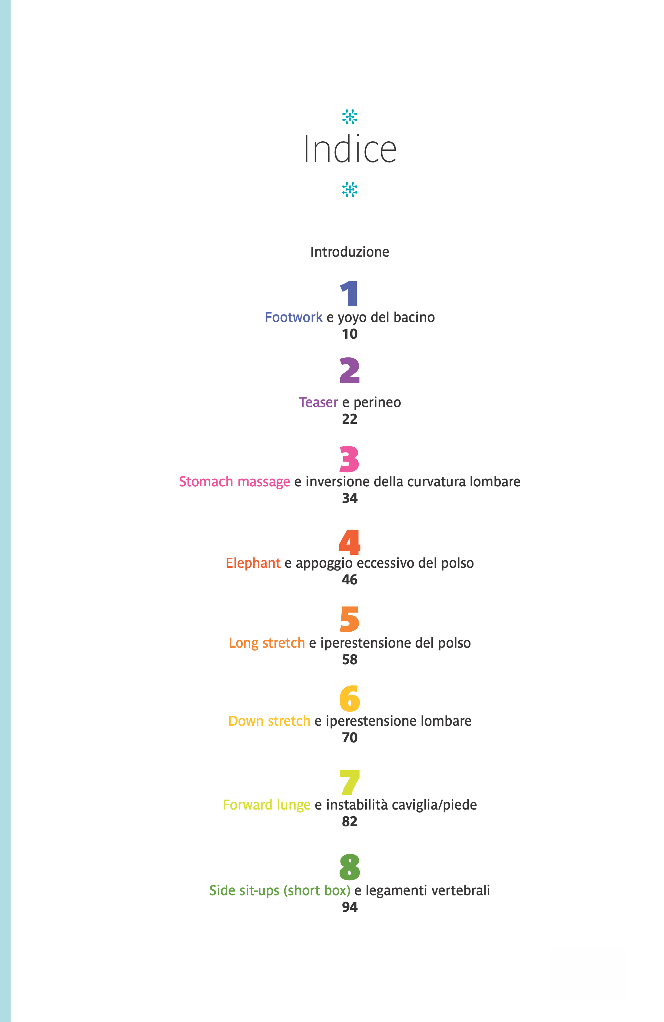 Ogni capitolo espone un rischio particolare legato a un determinato tipo di esercizio: ne presenta i motivi, propone delle soluzioni e descrive esercizi simili che si possono praticare sul Reformer e sul materassino Mat in cui può riproporsi lo stesso rischio.