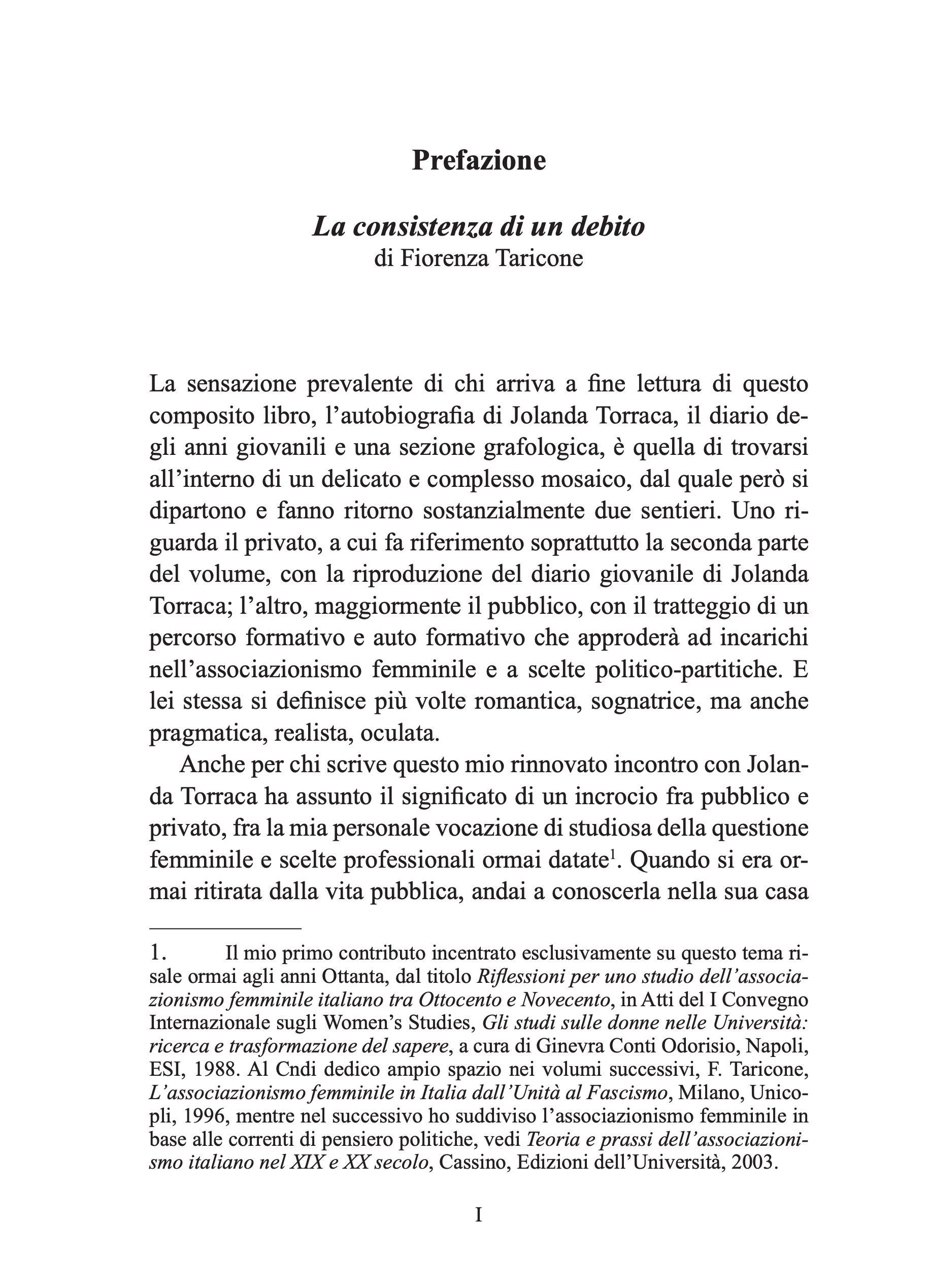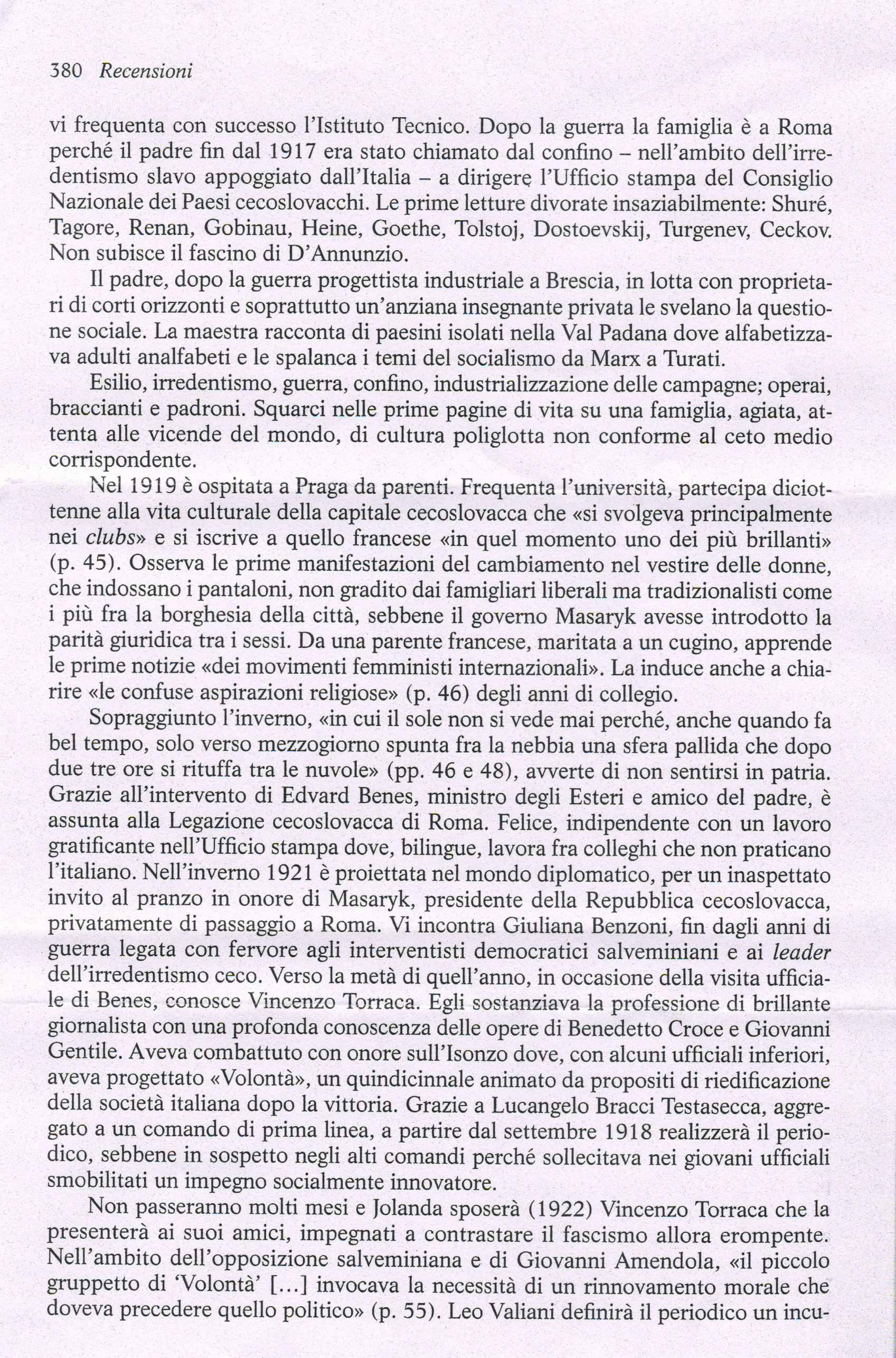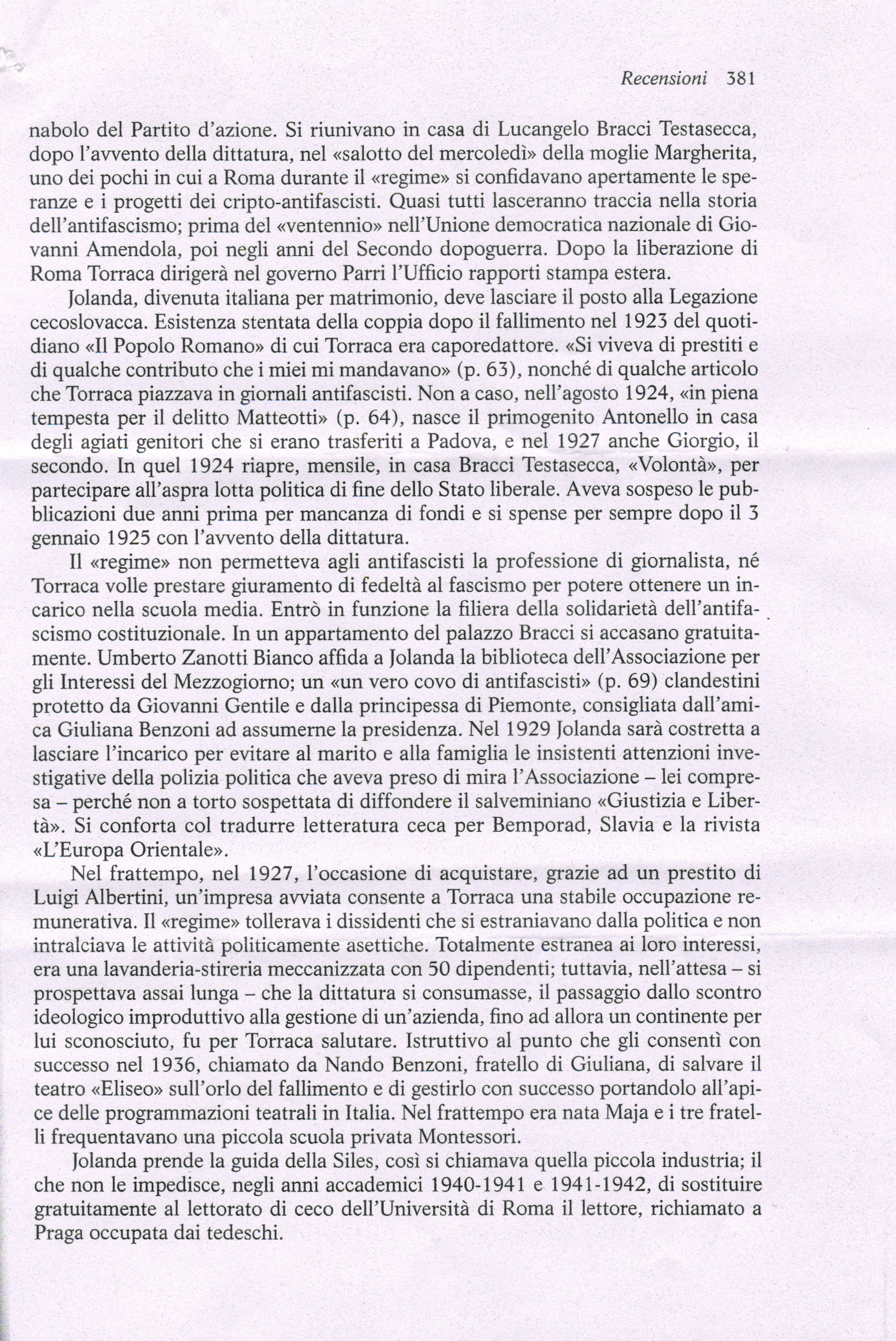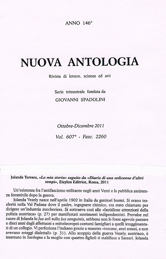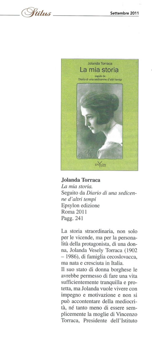 Una scrittura fresca e vivace, nonostante l’età avanzata, quella di Jolanda Vesely Torraca, figlia di genitori cecoslovacchi ma nata e cresciuta in Italia, che ci narra la storia della sua vita intrecciandola alla storia del movimento per l’affermazione dei diritti delle donne, alla sua attività culturale e giornalistica, al suo impegno nell’assistenza sociale alle madri nubili e ai loro bambini.