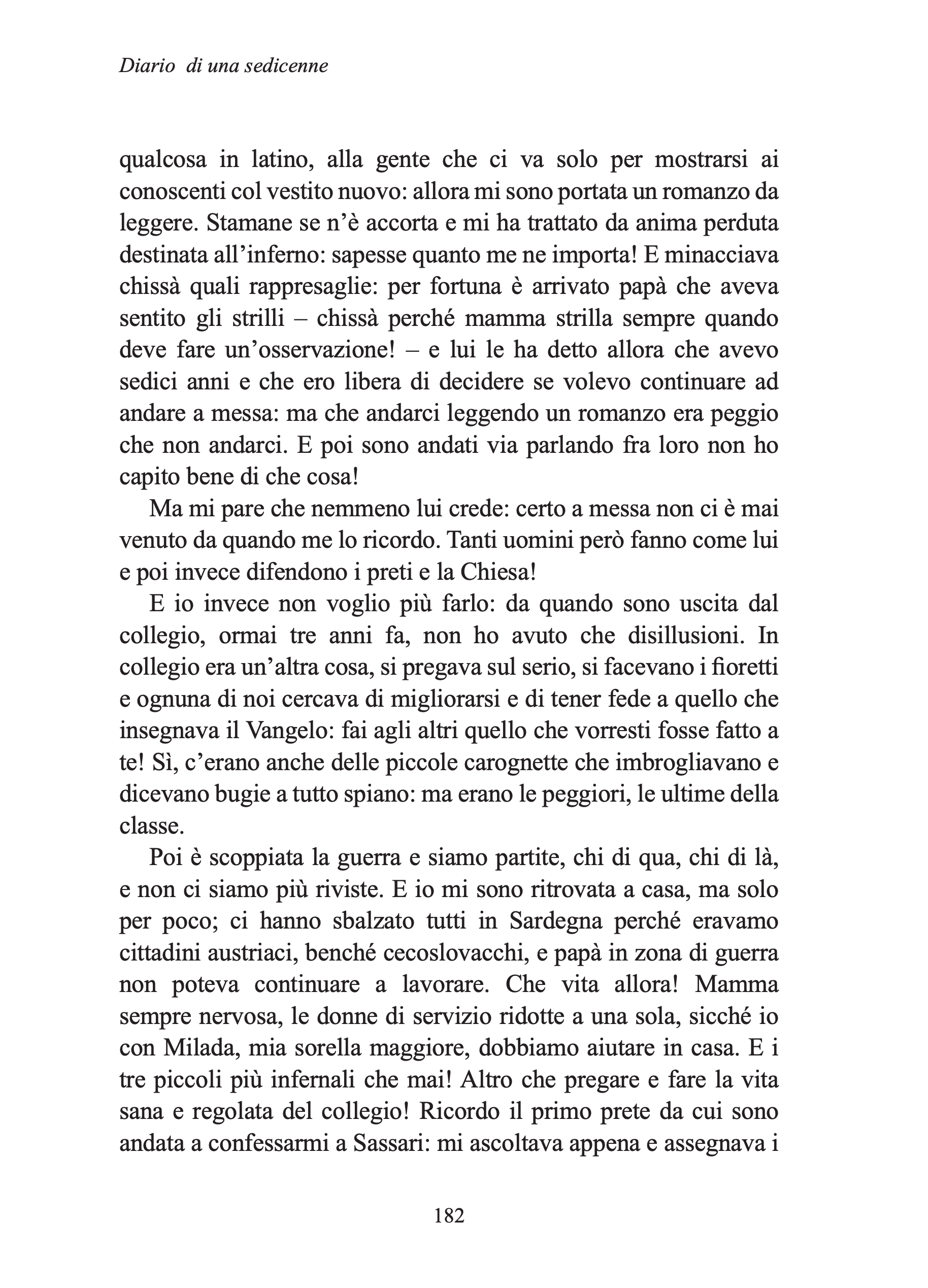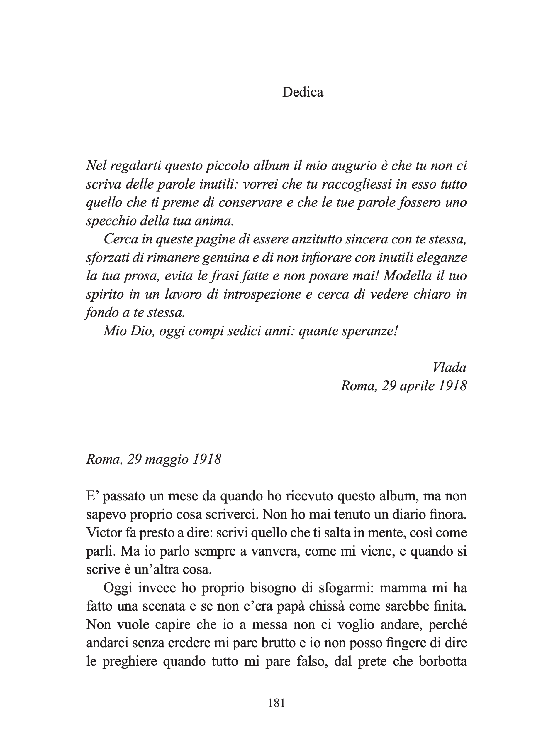 Nel quaderno che il cugino Vladimir Vanek detto “Victor”, importante collegamento con gli ambienti dell’indipendentismo céco e della Russia rivoluzionaria, le ha regalato per i suoi sedici anni, comincia a scrivere un diario che registra i sentimenti e gli eventi chiave della sua formazione. Questo diario, un vero “specchio dell’anima” di una sedicenne degli inizi del secolo, di straordinaria modernità, merita di essere letto in contrappunto con le memorie di bilancio di vita: e così, partendo dalle prime pagine di una giovanissima e precoce scrittrice, possiamo seguire Jolanda negli anni chiave della sua maturazione, dal 1918 al 1920.
